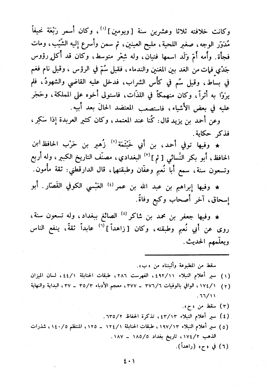 وفيها توفي أحمد، بن أبي خيثمة زهير بن حرب الحافظ ابن الحافظ أبو بكر النسائي ثم البغدادي. مصنف التاريخ الكبير، وله أربع وتسعون سنة، سمع أبا نعيم وعفان وطبقتهما.