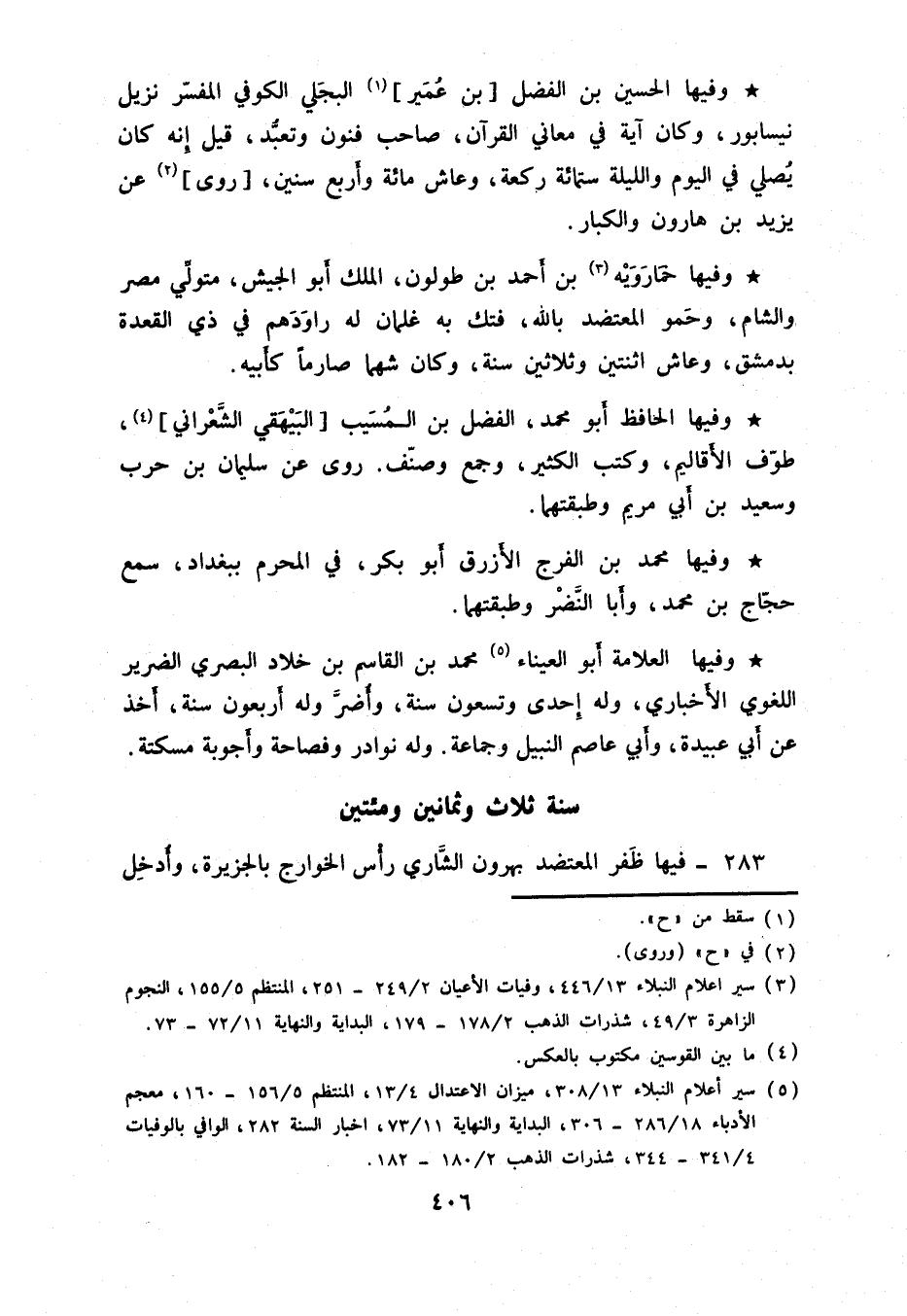 وفيها الحسين بن الفضل بن عمير البجلي الكوفي المفسر نزيل نيسابور، وكان آية في معاني القرآن، صاحب فنون وتعبد، قيل إنه كان يصلي في اليوم والليلة ستمائة ركعة، وعاش مائة وأربع سنين، روى عن يزيد بن هارون والكبار.