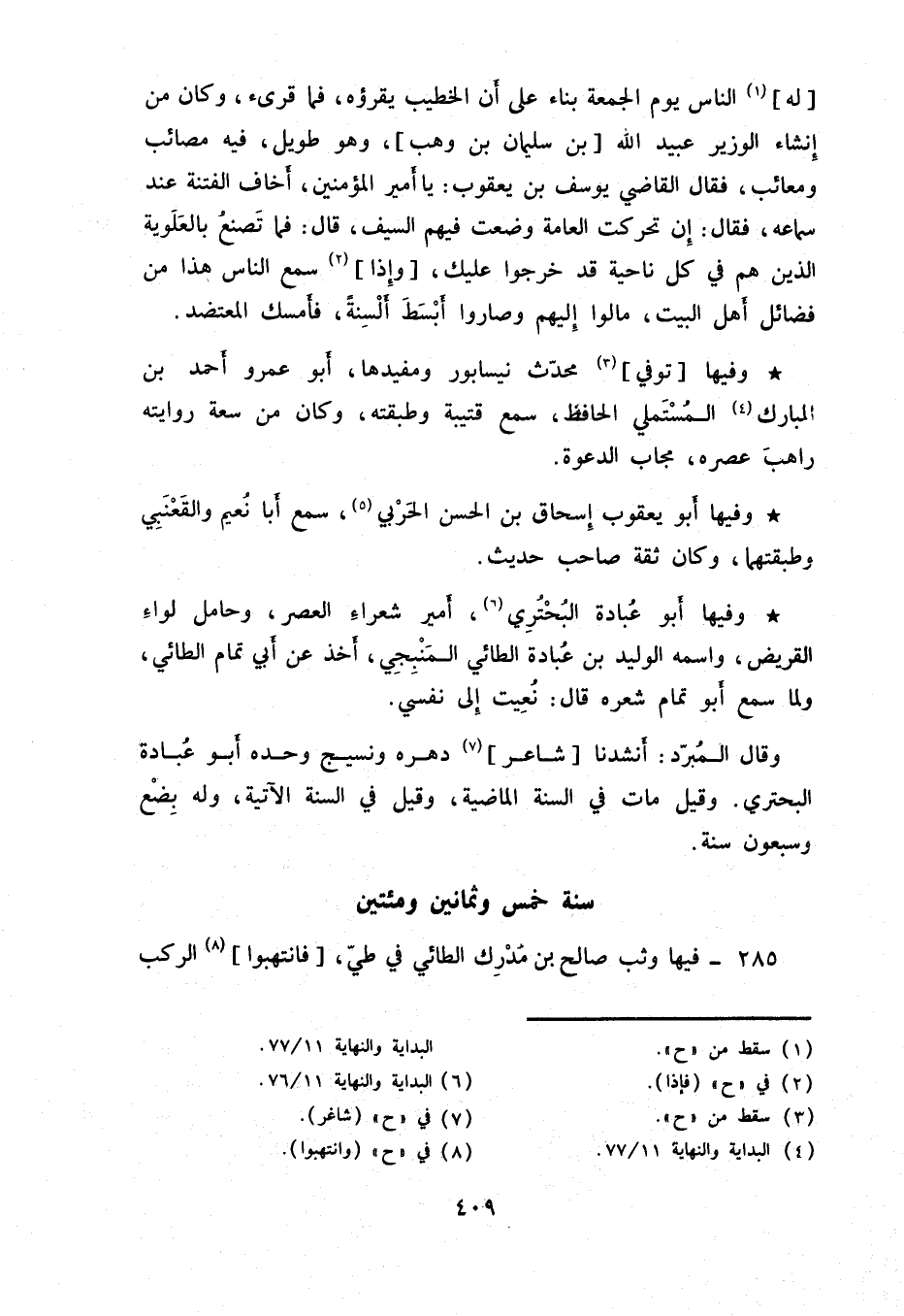 وفيها أبو عبادة البحتري، أمير شعراء العصر، وحامل لواء القريض، واسمه الوليد بن عبادة الطائي المنبجي، أخذ عن أبي تمام الطائي، ولما سمع أبو تمام شعره قال: نعيت إلى نفسي. وقال المبرد: أنشدنا شاعر دهره ونسيج وحده أبو عبادة البحتري. وقيل مات في السنة الماضية، وقيل في السنة الآتية، وله بضع وسبعون سنة.