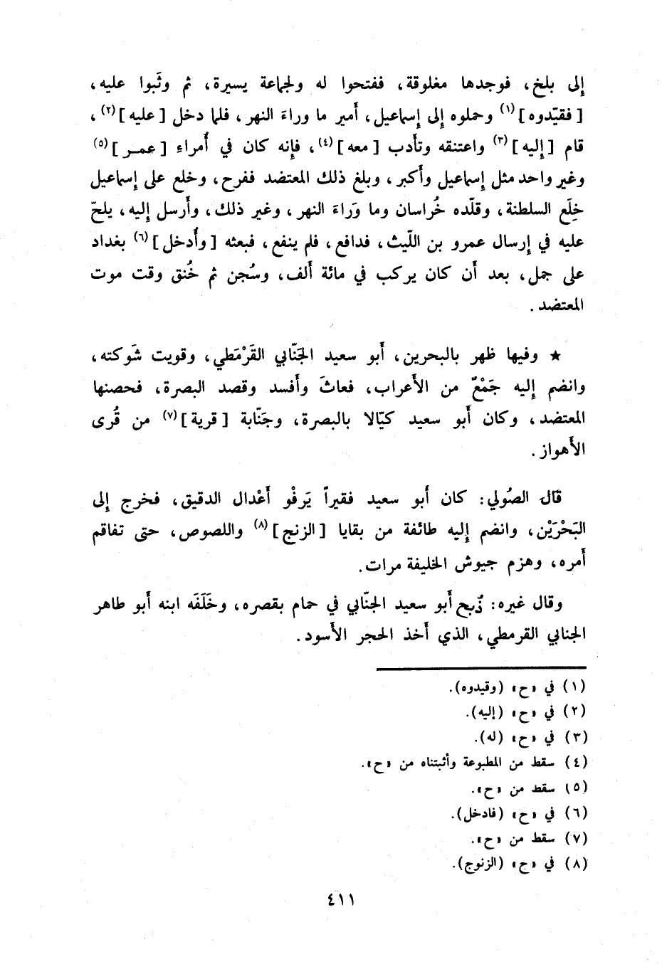 وقال غيره: ذبح أبو سعيد الجنابي في حمام بقصره، وخلفه ابنه أبو طاهر الجنابي القرمطي، الذي أخذ الحجر الأسود.