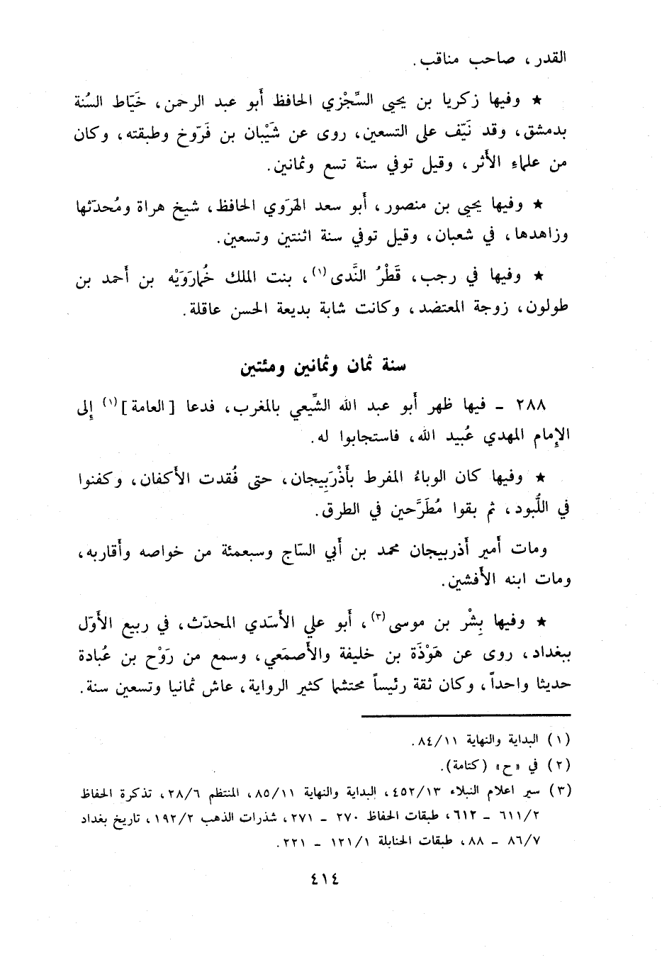 وفيها زكريا بن يحيى السجزي الحافظ أبو عبد الرحمن. خياط السنة بدمشق، وقد نيف على التسعين، روى عن شيبان بن فروخ وطبقته، وكان من علماء الأثر وقيل توفي سنة تسع وثمانين.