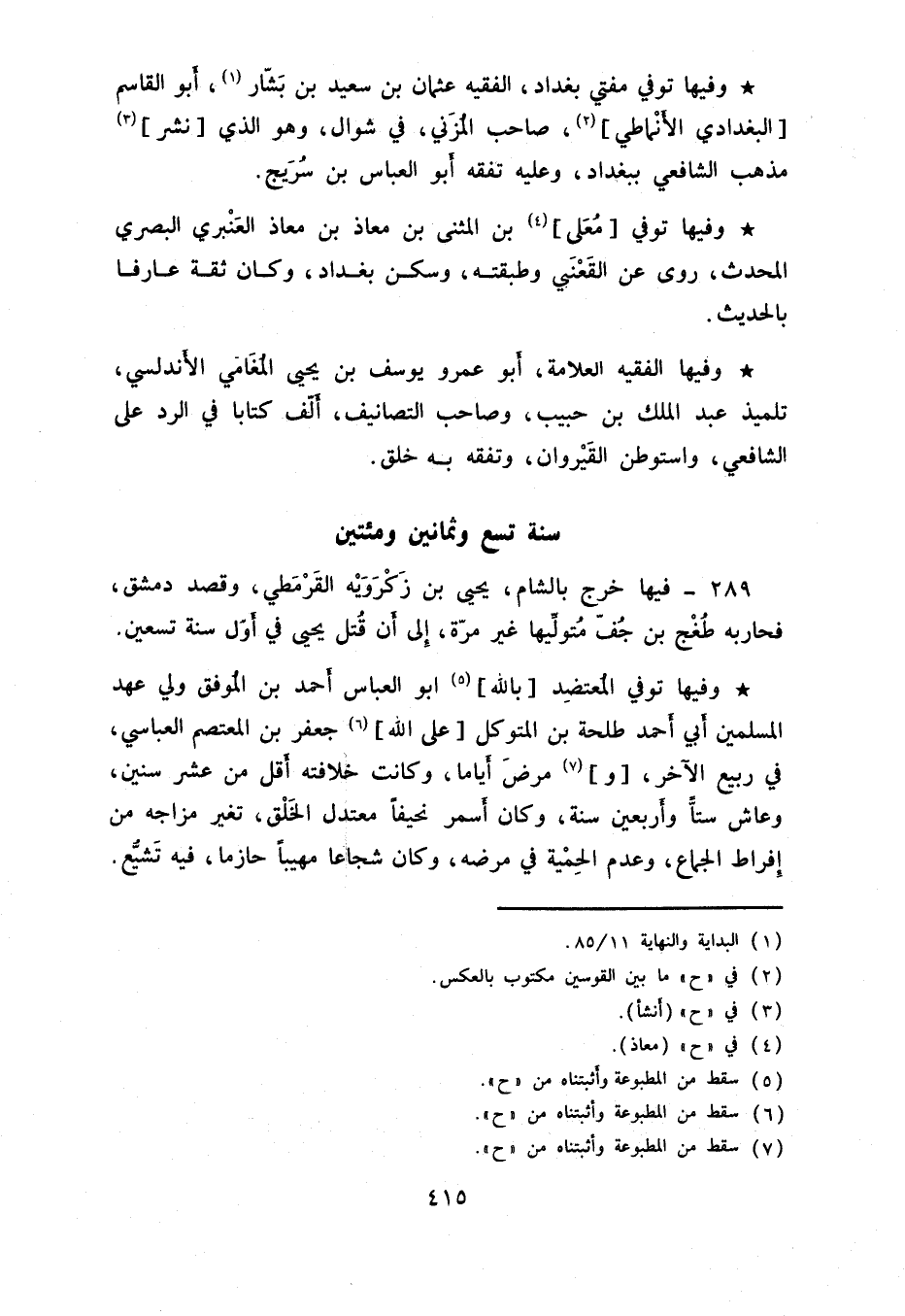 وفيها توفي مفتي بغداد، الفقيه عثمان بن سعيد بن بشار، أبو القاسم البغدادي الأنماطي، صاحب المزني، في شوال، وهو الذي نشر مذهب الشافعي ببغداد، وعليه تفقه أبو العباس بن سريج. وفيها توفي معلى بن المثنى بن معاذ بن معاذ العنبري البصري المحدث، روى عن القعنبي وطبقته، وسكن بغداد، وكان ثقة عارفا بالحديث.