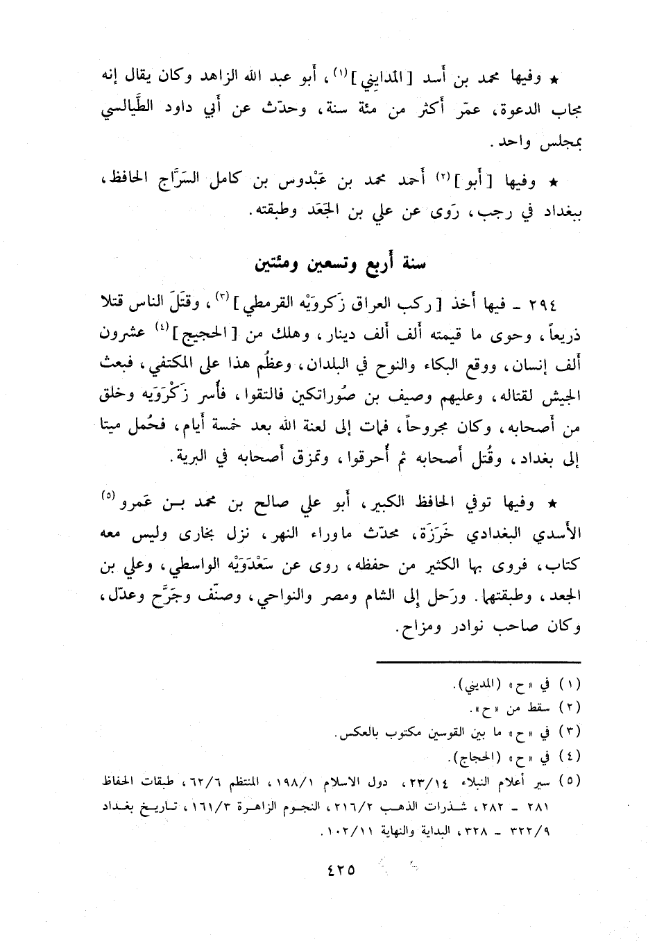 فيها أخذ ركب العراق زكرويه القرمطي، وقتل الناس قتلا ذريعاً، وحوى ما قيمته ألف ألف دينار. وهلك من الحجيج عشرون ألف إنسان، ووقع البكاء والنوح في البلدان، وعظم هذا على المكتفي، فبعث الجيش لقتاله، وعليهم وصيف بن صوراتكين فالتقوا، فأسر زكرويه وخلق من أصحابه. وكان مجروحاً. فمات إلى لعنة الله بعد خمسة أيام، فحمل ميتا إلى بغداد، وقتل أصحابه ثم أحرقوا، وتمزق أصحابه في البرية.