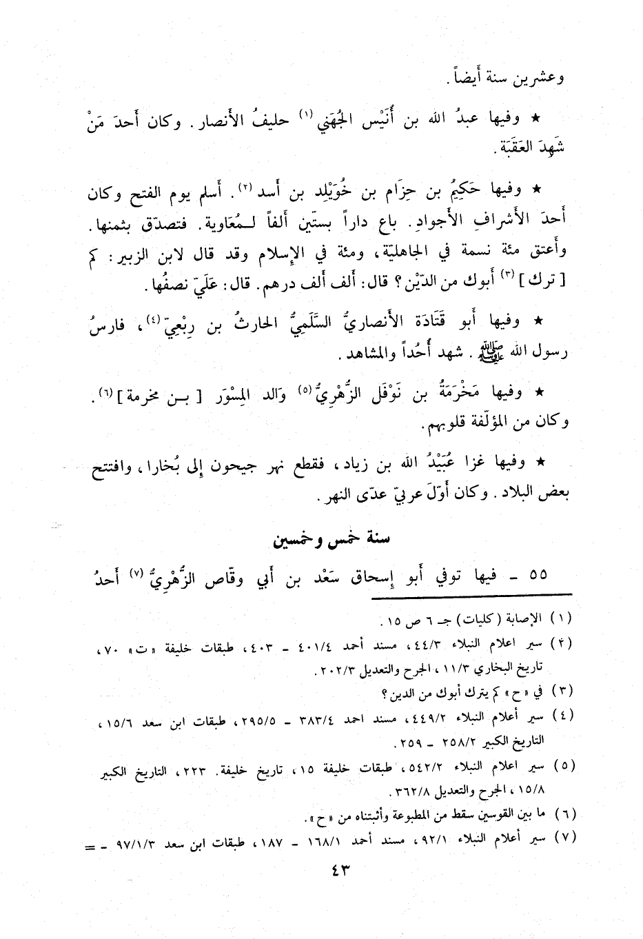 وفيها حكيم بن حزام بن خويلد بن أسد. أسلم يوم الفتح وكان أحد الأشراف الأجواد. باع داراً بستين ألفاً لمعاوية. فتصدق بثمنها. وأعتق مئة نسمة في الجاهلية، ومئة في الإسلام وقد قال لابن الزبير: كم ترك أبوك من الدين؟ قال: ألف ألف درهم. قال: علي نصفها.