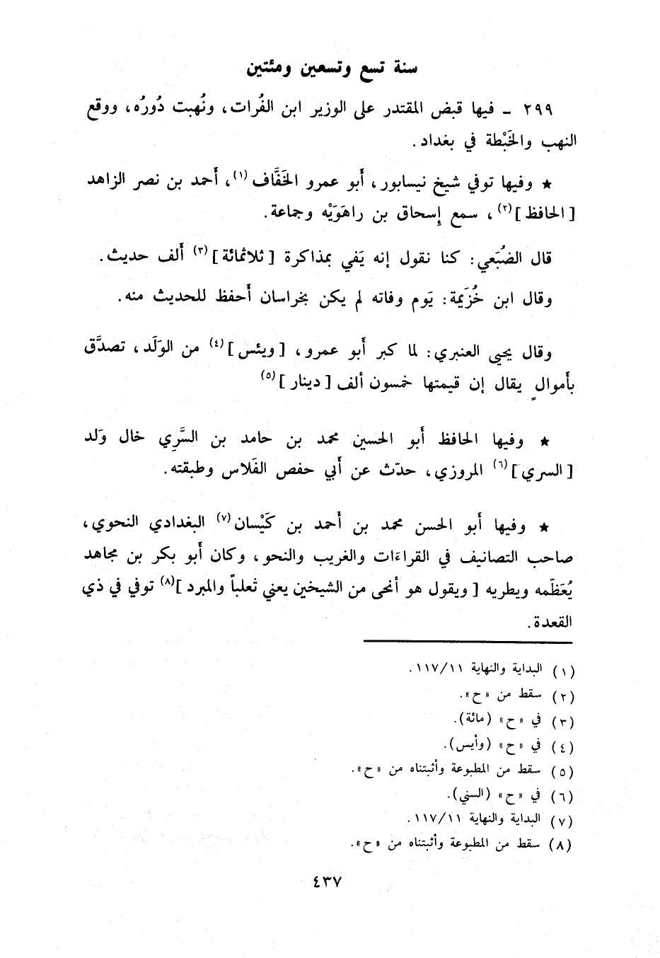 وفيها أبو الحسن محمد بن أحمد بن كيسان البغدادي النحوي، صاحب التصانيف في القراءات والغريب والنحو، وكان أبو بكر بن مجاهد يعظمه ويطريه ويقول وهو أنحى من الشيخين يعني ثعلباً والمبرد توفي في ذي القعدة.
