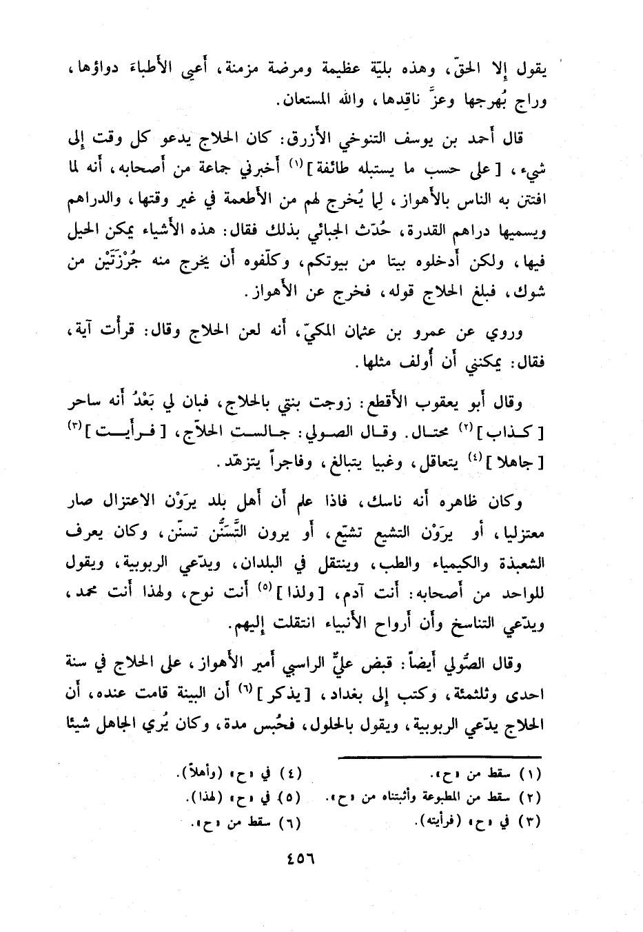 وقال الصولي أيضاً: قبض علي الراسبي أمير الأهواز على الحلاج في سنة احدى وثلثمئة وكتب إلى بغداد يكر أن البينة قامت عنده أن الحلاج يدعي الربوبية ويقول بالحلول فحبس مدة وكان يري الجاهل شيئاً