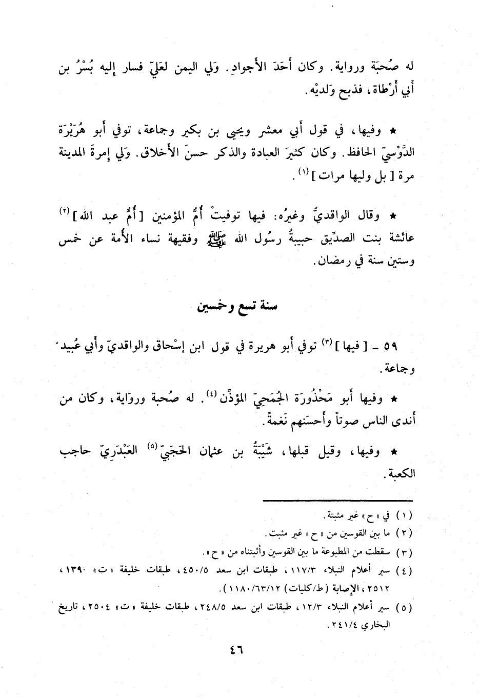 وفيها، في قول أبي معشر ويحيى بن بكير وجماعة، توفي أبو هريرة الدوسي الحافظ. وكان كثير العبادة والذكر حسن الأخلاق. ولي إمرة المدينة مرة بل وليها مرات.