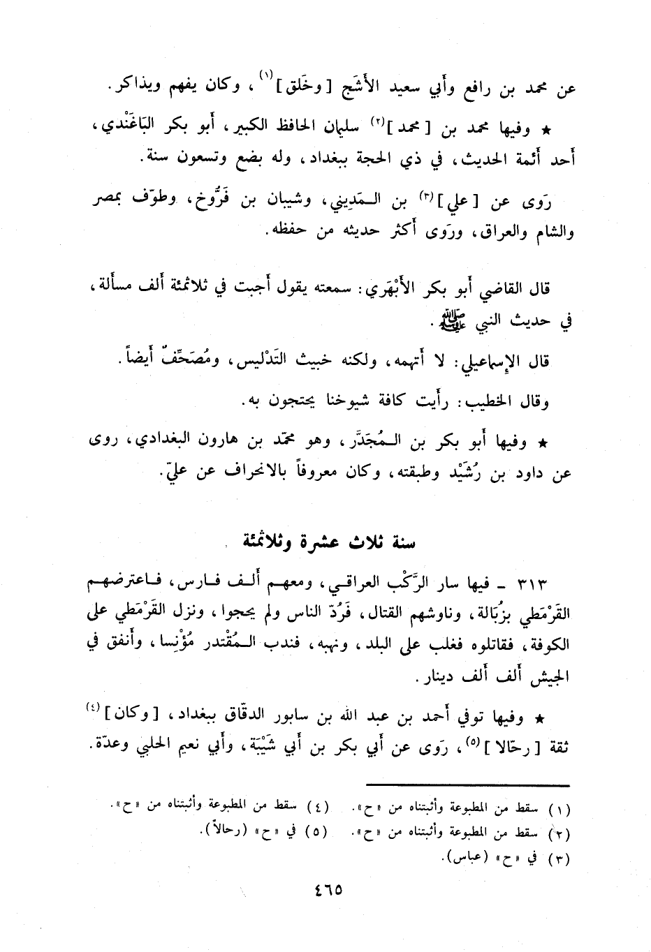 وفيها محمد بن محمد سليمان الحافظ الكبير. أبو بكر الباغندي، أحد أئمة الحديث، في ذي الحجة ببغداد. وله بضع وتسعون سنة.