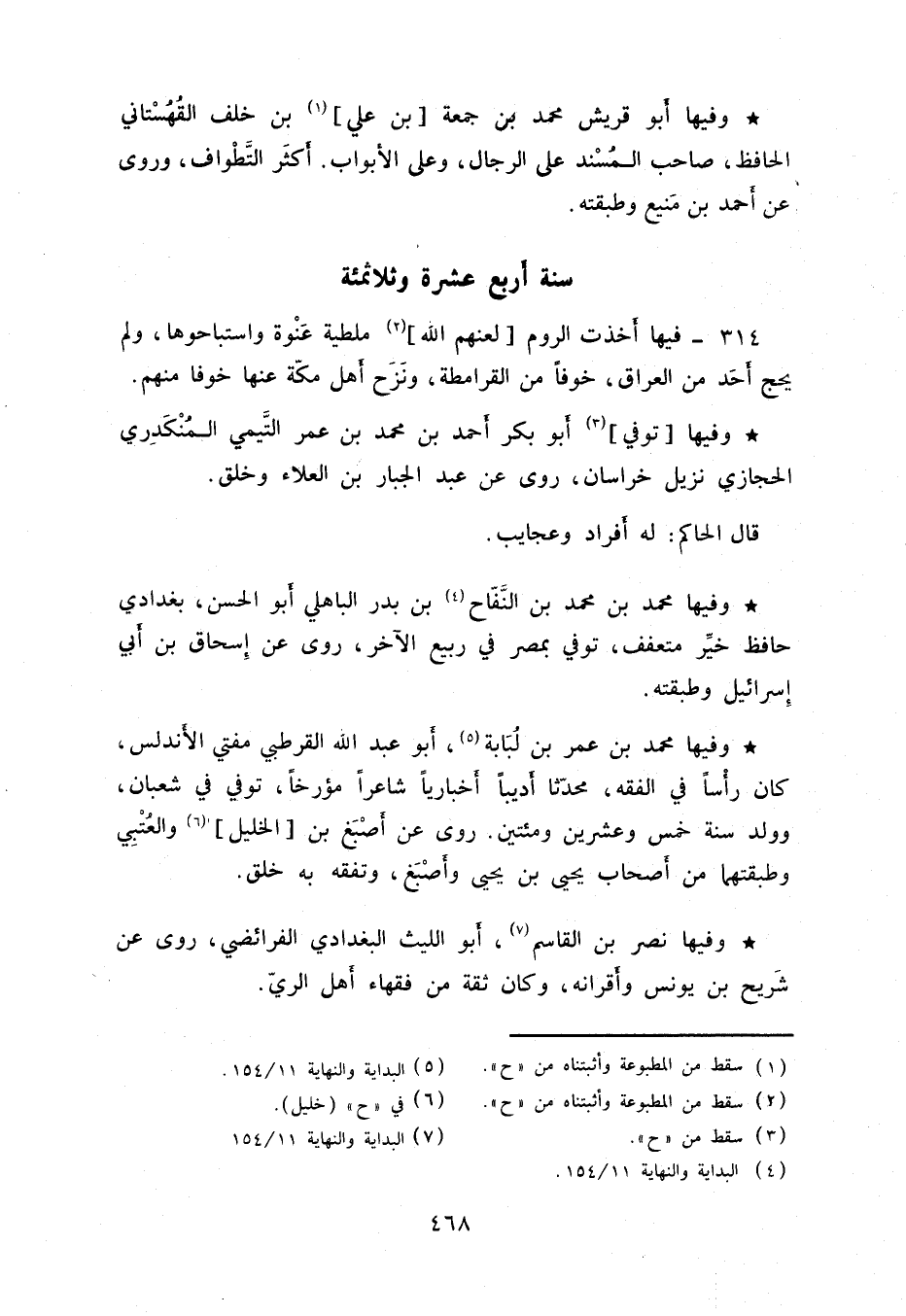وفيها أبو قريش محمد بن جمعة بن علي بن خلف القهستاني الحافظ. صاحب المسند على الرجال، وعلى الأبواب. أكثر التطواف، وروى عن أحمد بن منيع وطبقته.