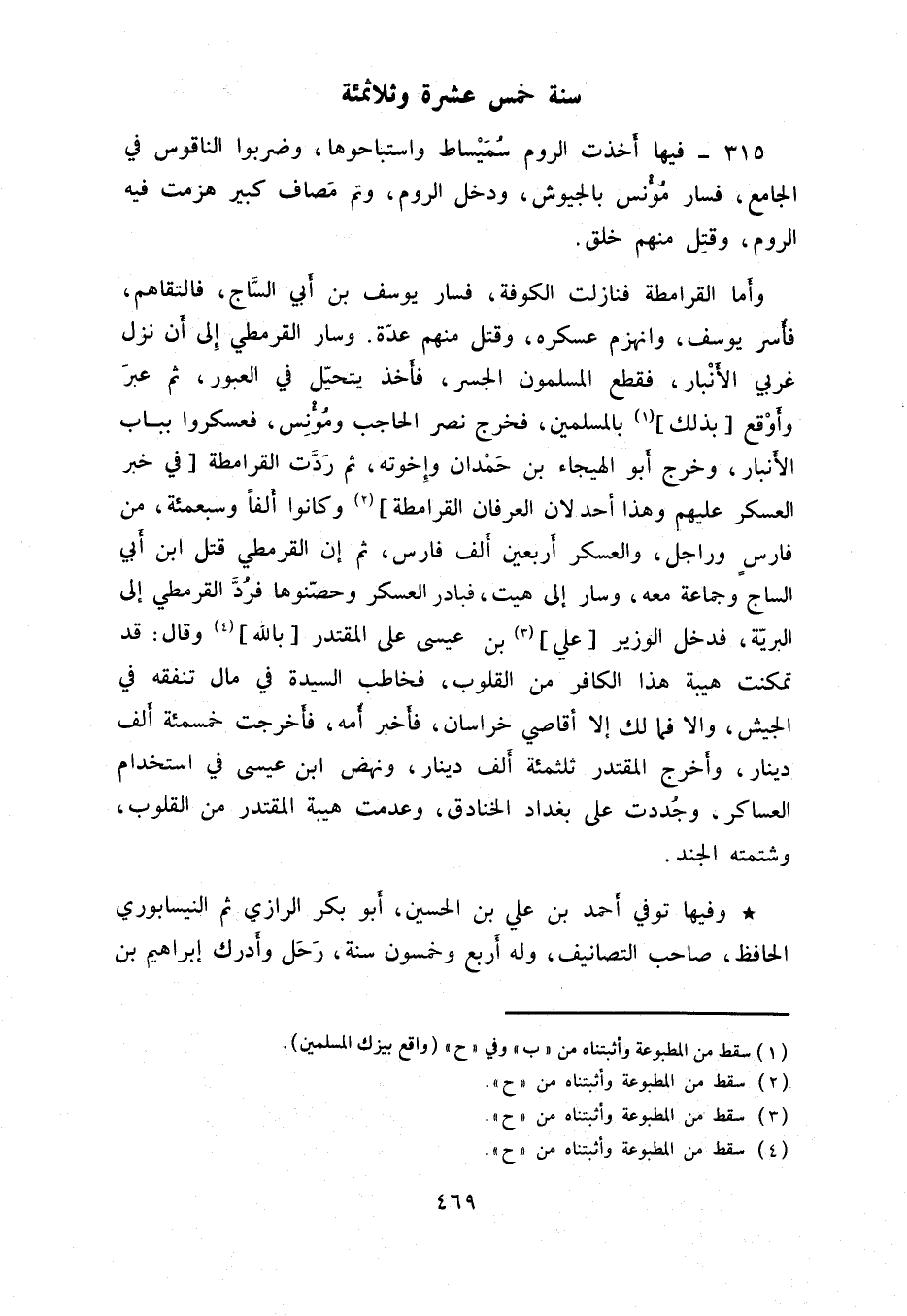 وأما القرامطة فنازلت الكوفة. فسار يوسف بن أبي الساج. فالتقاهم. فأسر يوسف، وانهزم عسكره، وقتل منهم عدة. وسار القرمطي إلى أن نزل غربي الأنبار. فقطع المسلمون الجسر. فأخذ يتحيل في العبور. ثم عبر وأوقع بذلك بالمسلمين. فخرج نصر الحاجب ومؤنس. فعسكروا بباب الأنبار. وخرج أبو الهيجاء بن حمدان وإخوته. ثم ردت القرامطة في خبر العسكر عليهم وهذا أحد لان العرفان القرامطة وكانوا ألفاً وسبعمئة. من فارس وراجل. والعسكر أربعين ألف فارس، ثم إن القرمطي قتل ابن أبي الساج وجماعة معه. وسار إلى هيت، فبادر العسكر وحصنوها فرد القرمطي إلى البرية، فدخل الوزير علي بن عيسى على المقتدر بالله وقال: قد تمكنت هيبة هذا الكافر من القلوب. فخاطب السيدة في مال تنفقه في الجيش، والا فما لك إلا أقاصي خراسان. فأخبر أمه. فأخرجت خمسمئة ألف دينار، وأخرج المقتدر ثلثمئة ألف دينار. ونهض ابن عيسى في استخدام العساكر، وجددت على بغداد الخنادق، وعدمت هيبة المقتدر من القلوب. وشتمته الجند.