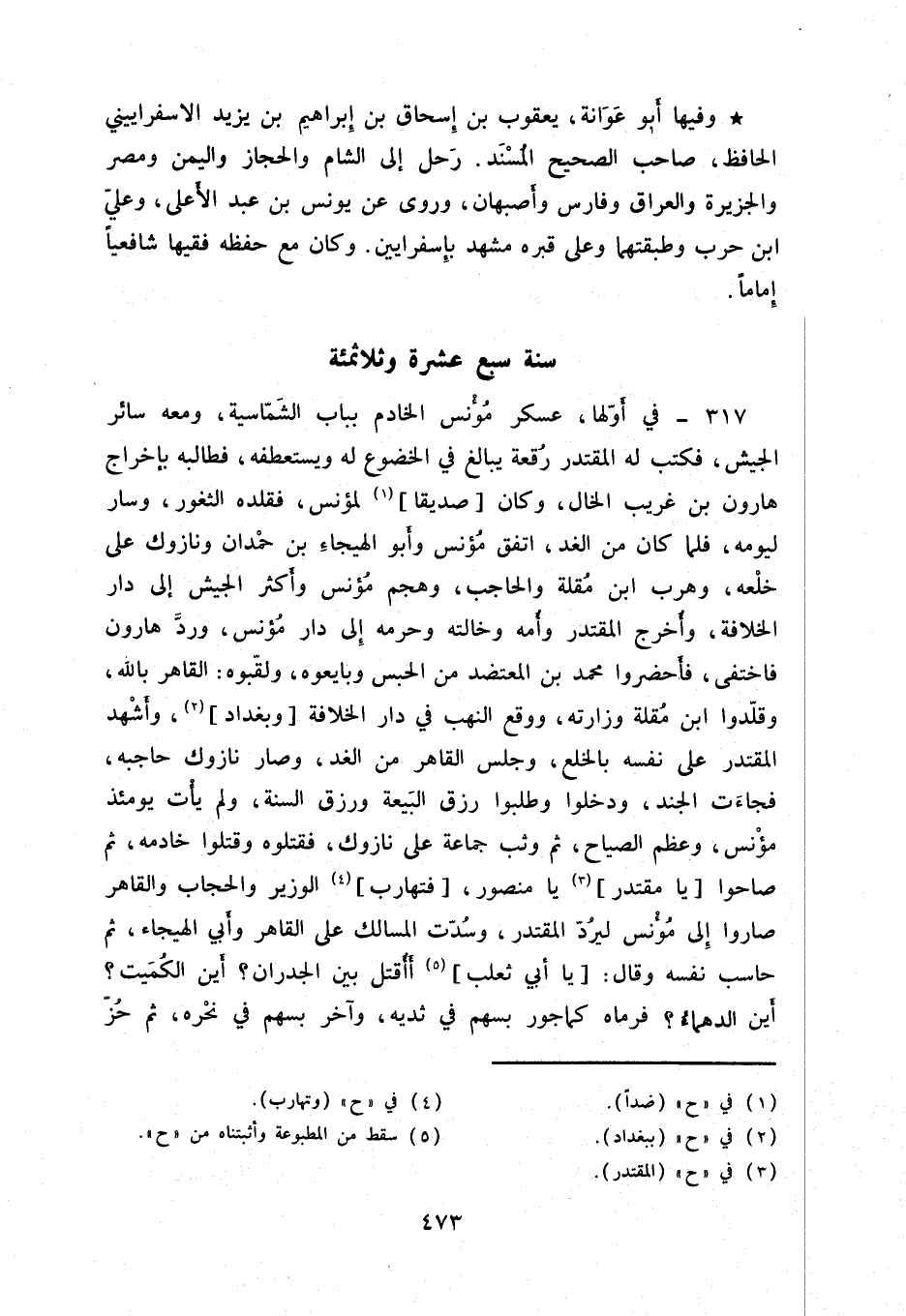 في أولها، عسكر مُؤنس الخادم بباب الشَماسية، ومعه سائر الجيش، فكتب له المقتدر رقعة يبالغ في الخضوع له ويستعطفه، فطالبه بإخراج هارون بن غريب الخال، وكان صديقا لمؤنس، فقلده الثغور، وسار ليومه، فلما كان من الغد، اتفق مؤنس وأبو الهيجاء بن حمدان ونازوك على خلعه. وهرب ابن مقلة والحاجب، وهجم مؤنس وأكثر الجيش إلى دار الخلافة، وأخرج المقتدر وأمه وخالته وحرمه إلى دار مؤنس، وردّ هارون فاختفى، فأحضروا محمد بن المعتضد من الحبس وبايعوه، ولقّبوه: القاهر بالله، وقلدوا ابن مقُلة وزارته، ووقع النهب في دار الخلافة وبغداد، وأشهد المقتدر على نفسه بالخلع، وجلس القاهر من الغد، وصار نازوك حاجبه، فجاءت الجند، ودخلوا وطلبوا رزق البيعة ورزق السنة، ولم يأت يومئذ مؤنس، وعظم الصياح، ثم وثب جماعة على نازوك فقتلوه وقتلوا خادمه، ثم صاحوا يا مقتدر يا منصور، فتهارب الوزير والحجاب والقاهر صاروا إلى مؤنس ليرد المقتدر، وسُدت المسالك على القاهر وأبي الهيجاء، ثم حاسب نفسه وقال: يا أبي ثعلب أأُقتل بين الجدران؟ أين الكُمَيت؟ أين الدهماء؟ فرماه كما جور بسهم في ثديه، وآخر بسهم في نحره، ثم حز