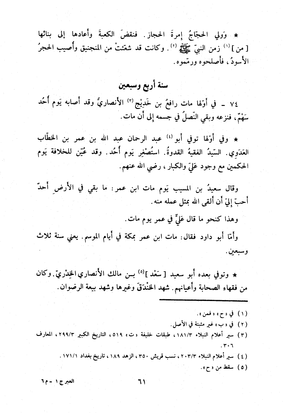 وفي أولها توفي أبو عبد الرحمن عبد الله بن عمر بن الخطاب العدوي. السيد الفقيه القدوة. استصغر يوم أحد. وقد عين للخلافة يوم الحكمين مع وجود علي والكبار، رضي الله عنهم.