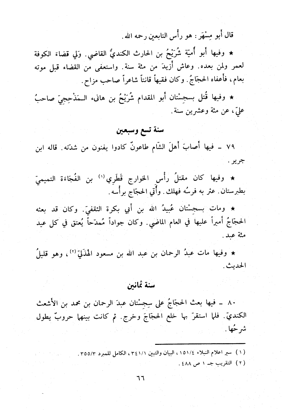وفيها أبو أمية شريح بن الحارث الكندي القاضي. وولي قضاء الكوفة لعمر ولمن بعده. وعاش أزيد من مئة سنة. واستعفى من القضاء قبل موته بعام، فأعفاه الحجاج. وكان فقيهاً قانتاً شاعراً صاحب مزاح.