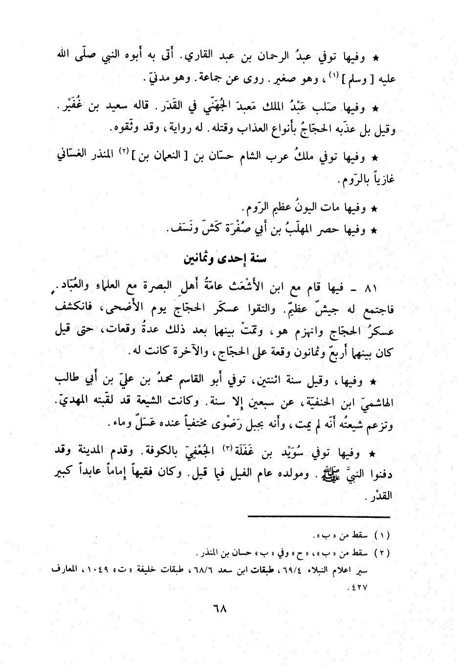 وفيها توفي سويد بن غفلة الجعفي بالكوفة. وقدم المدينة وقد دفنوا النبي صلى الله عليه وسلم. ومولده عام الفيل فيما قيل. وكان فقيهاً إماماً عابداً كبير القدر.