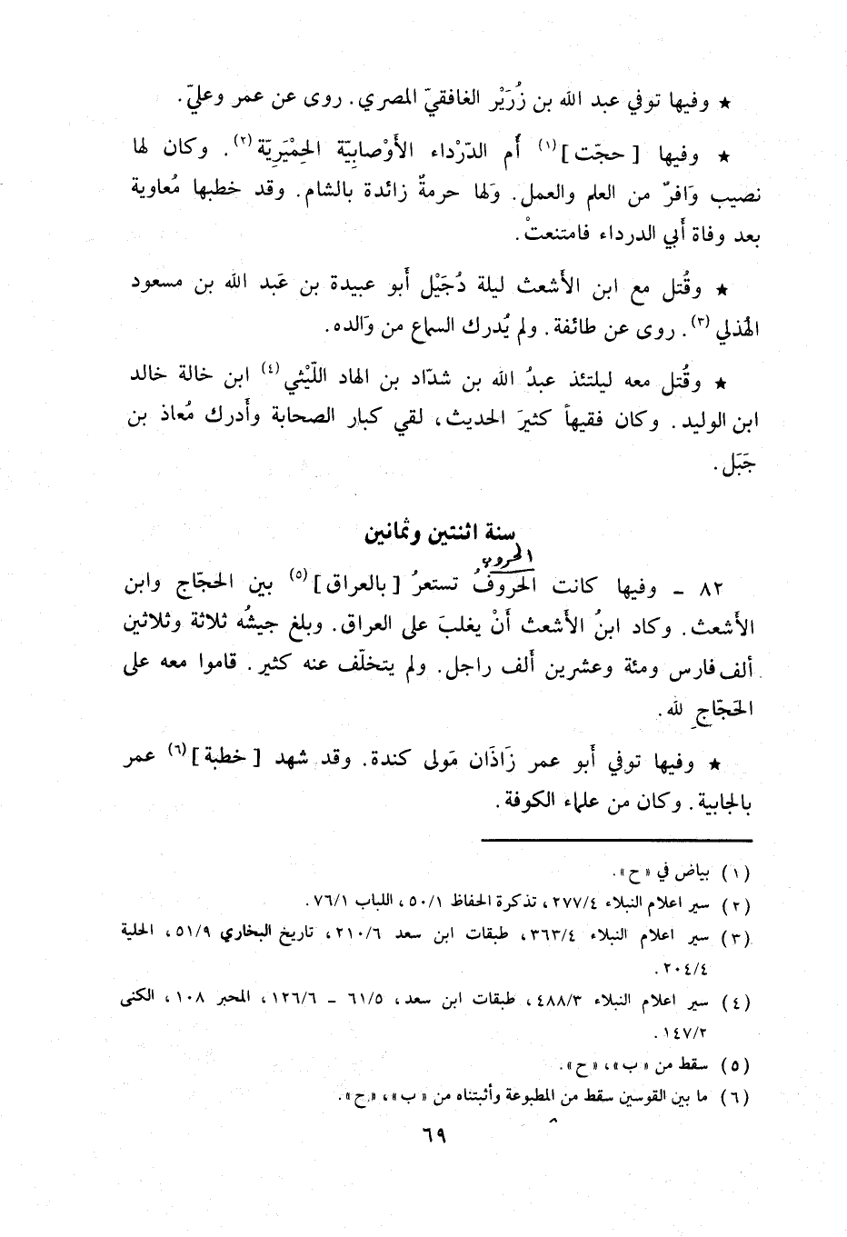 وفيها حجت أم الدرداء الأوصابية الحميرية. وكان لها نصيب وافر من العلم والعمل. ولهاحرمة زائدة بالشام. وقد خطبها معاوية بعد وفاة أبي الدرداء فامتنعت. وقتل مع ابن الأشعث ليلة دجيل أبو عبيدة بن عبد الله بن مسعود الهذلي. روى عن طائفة. ولم يدرك السماع من والده. وقتل معه ليلتئذ عبد الله بن شداد بن الهاد الليثي ابن خالة خالد ابن الوليد. وكان فقيها " كثير الحديث، لقي كبار الصحابة وأدرك معاذ بن جبل