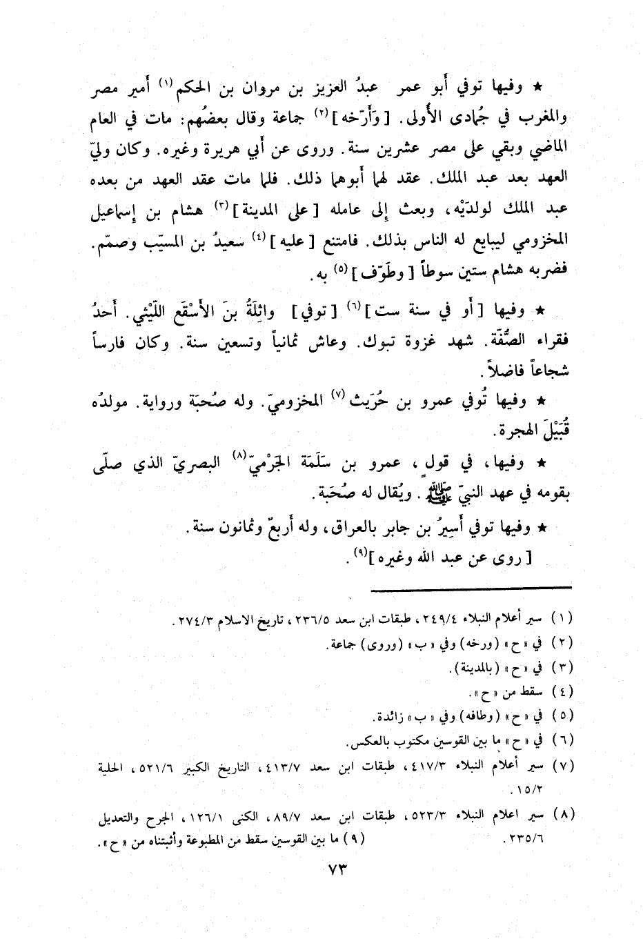 وفيها أو في سنة ست توفي واثلة بن الأسقع الليثي. أحد فقراء الصفة. شهد غزوة تبوك. وعاش ثمانياً وتسعين سنة. وكان فارساً شجاعاً فاضلاً.