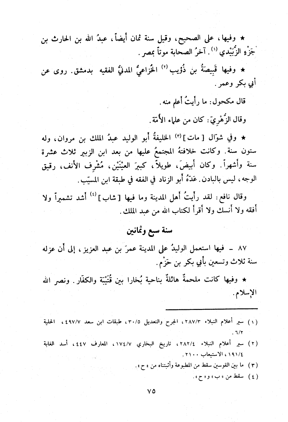 وفيها قبيصة بن ذؤيب الخزاعي المدني الفقيه بدمشق. روى عن أبي بكر وعمر.