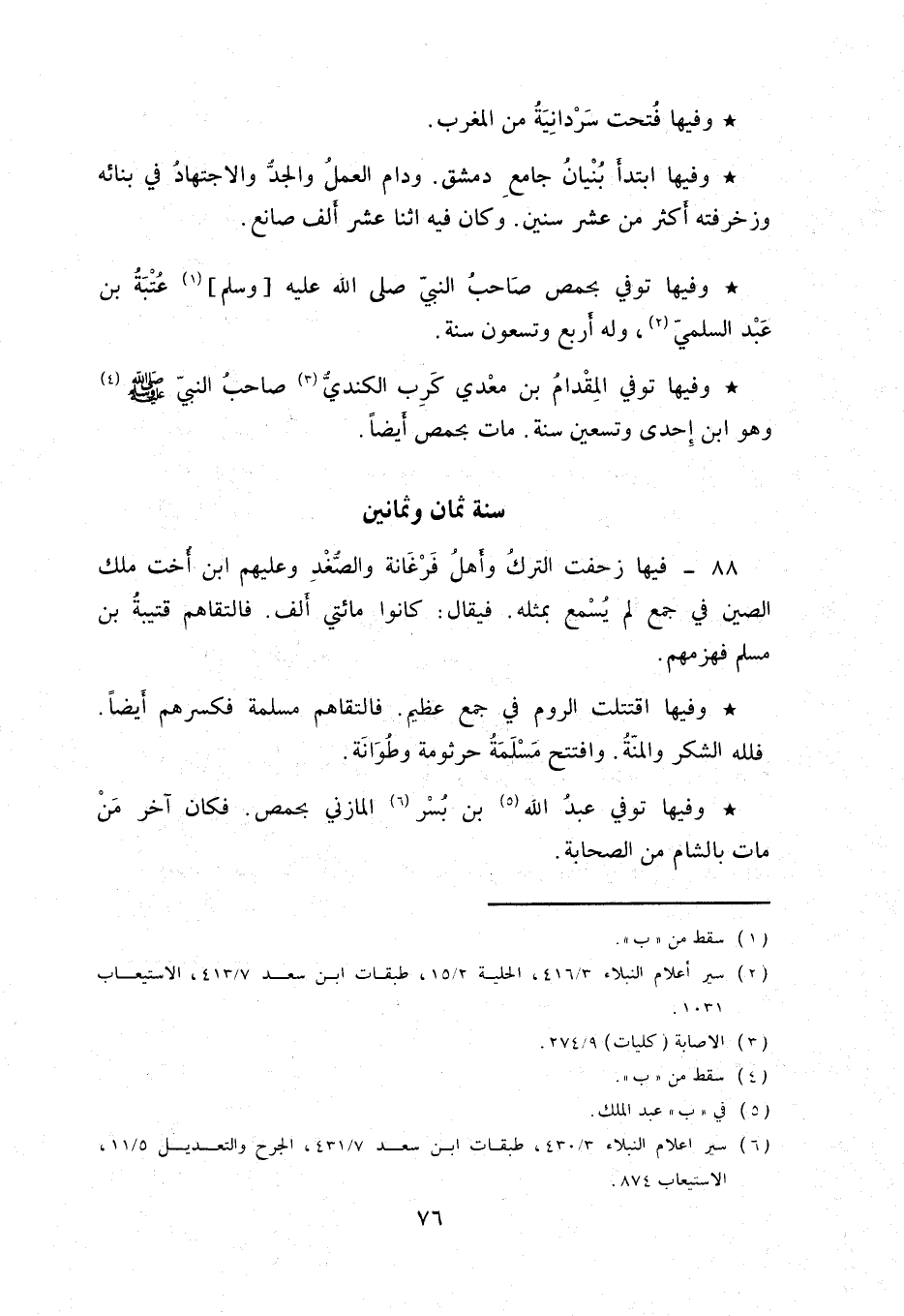 وفيها توفي بحمص صاحب النبي صلى الله عليه وسلم عتبة بن عبد السلمي، وله أربع وتسعون سنة.