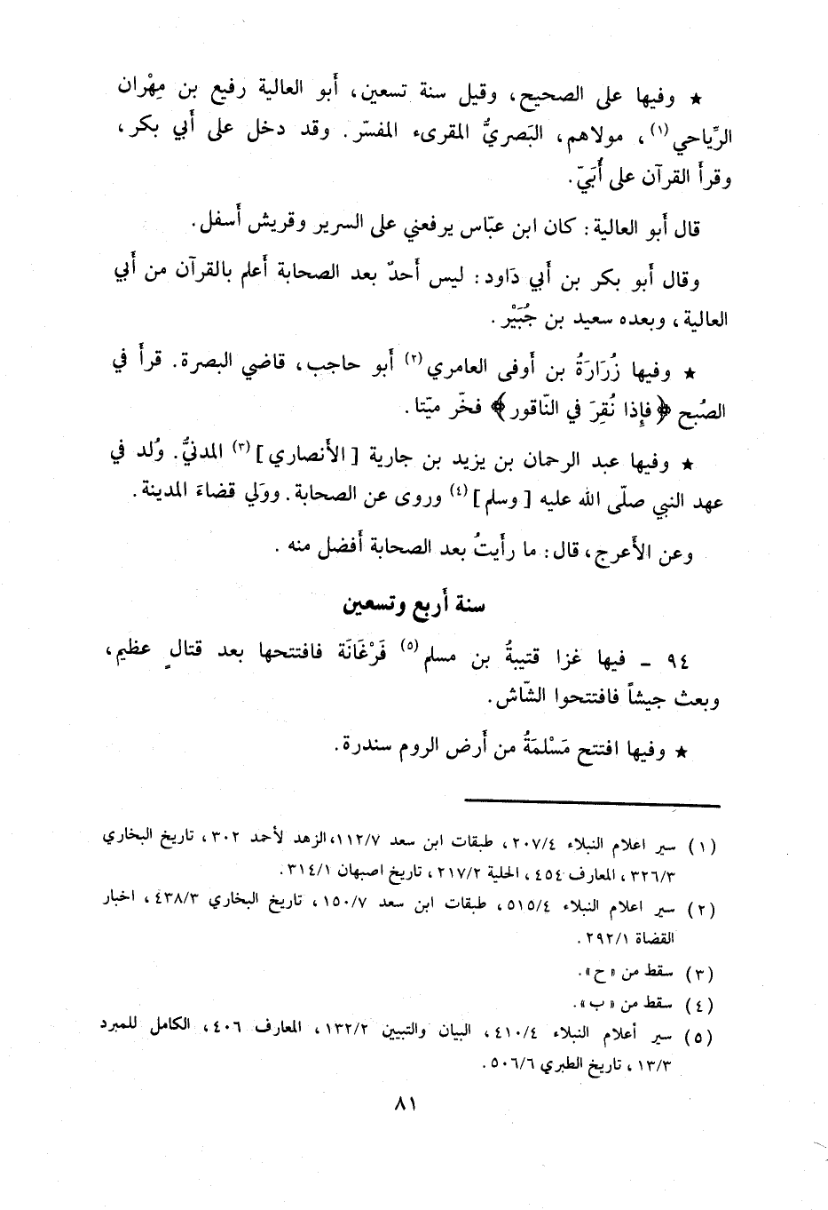 وفيها زرارة بن أوفى العامري أبو حاجب، قاضي البصرة. قرأ في الصبح: " فإذا نقر في الناقور " فخر ميتاً.