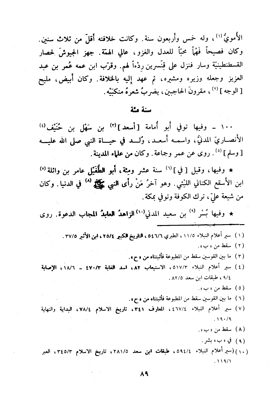 وفيها توفي أبو أمامة أسعد بن سهل بن جنيف الأنصاري المدني، واسمه أسعد، ولد في حياة النبي صلى الله عليه وسلم. روى عن عمر وجماعة. وكان من علماء المدينة.