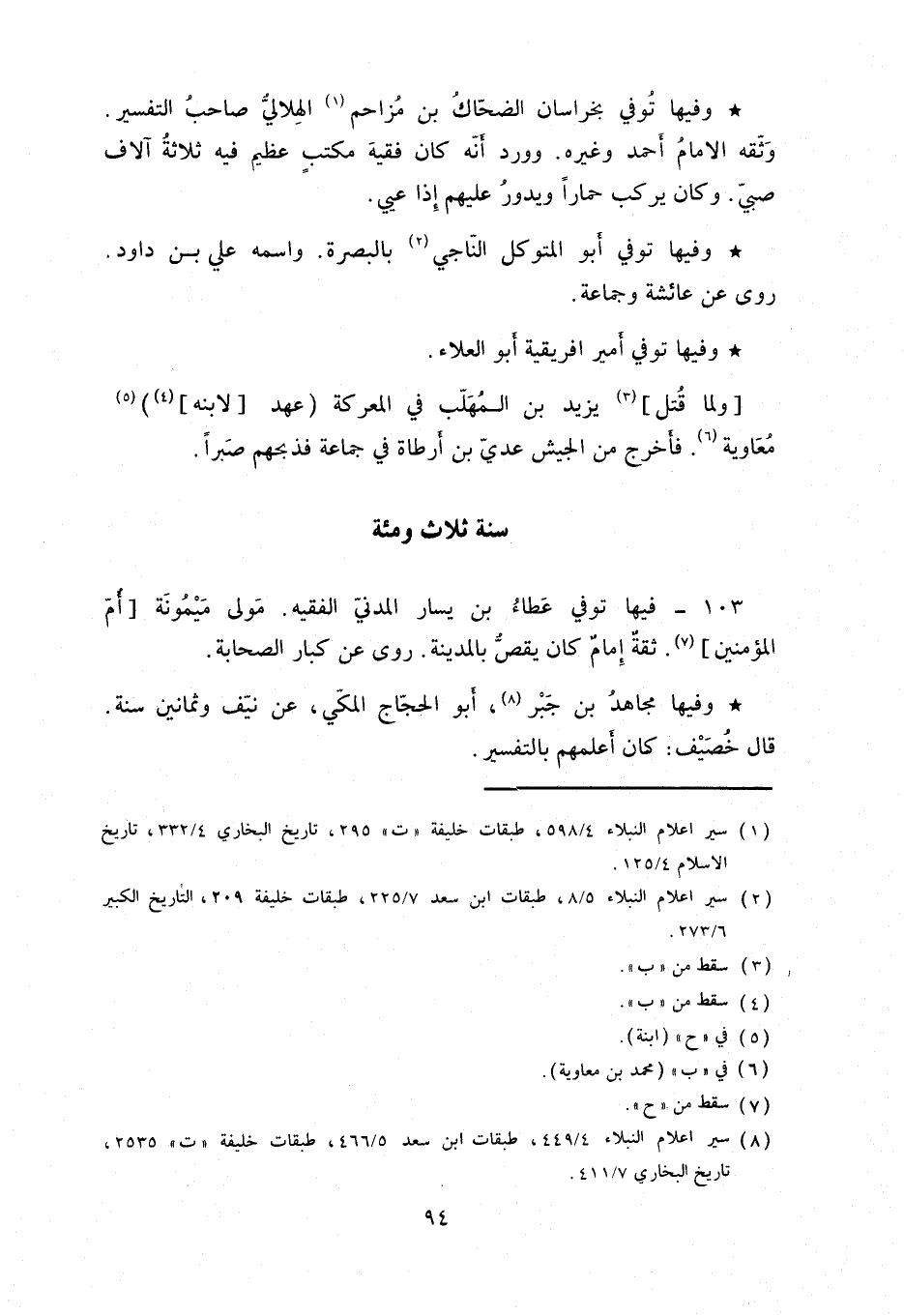 فيها توفي عطاءُ بن يسار المدني الفقيه. مَولى مَيمونة أم المؤمنين. ثقة إمام كان يقص بالمدينة. روى عن كبار الصحابة.