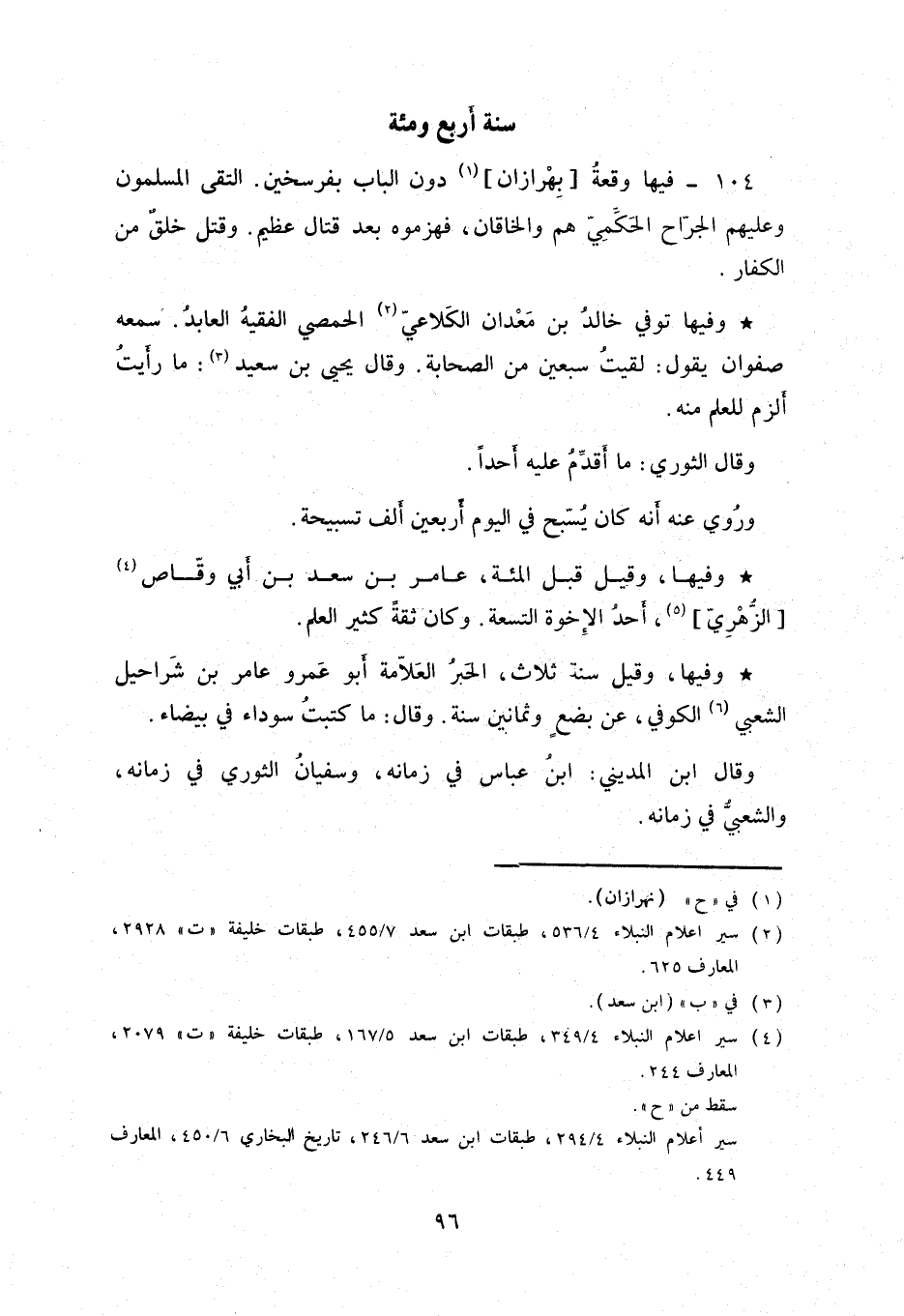 وفيها توفي خالد بن معدان الكلاعي الحمصي الفقيه العابدْ. سمعه صفوان يقول: لقيت سبعين من الصحابة. وقال يحيى بن سعيد: ما رأيتُ ألزم للعلم منه.
