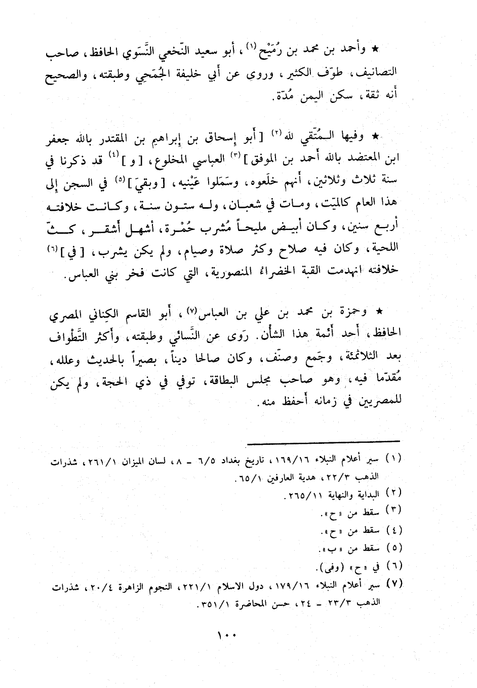 وحمزة بن محمد بن علي بن العباس، أبو القاسم الكناني المصري الحافظ، أحد أئمة هذا الشأن. روى عن النَّسائي وطبقته، وأكثر التَّطواف بعد الثلاثمئة، وجمع وصنّف، وكان صالحاً ديناً، بصيراً بالحديث وعلله، مقدّماً فيه، وهو صاحب مجلس البطاقة، توفي في ذي الحجة، ولم يكن للمصريين في زمانه أحفظ منه.