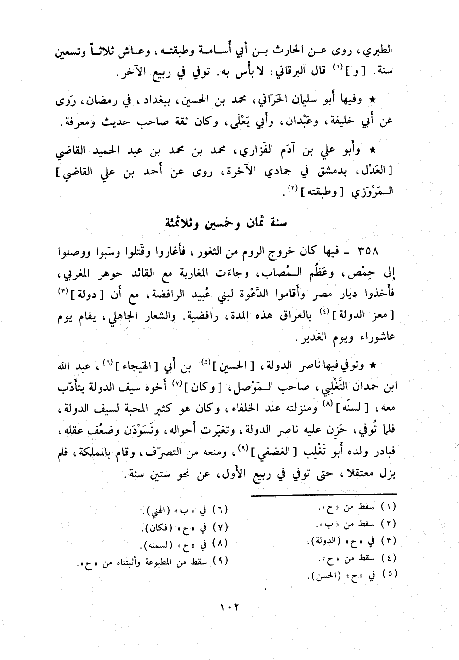 وتوفي فيها ناصر الدولة، الحسين بن أبي الهيجاء، عبد الله ابن حمدان التَّغلبي، صاحب الموصل، وكان أخوه سيف الدولة يتأدّب معه، لسنّه ومنزلته عند الحلفاء، وكان هو كثير المحبة لسيف الدولة، فلما توفي، حزن عليه ناصر الدولة، وتغيّرت أحواله، وتسودن وضعف عقله، فبادر ولده أبو تغلب الغضفي، ومنعه من التصرّف وقام بالمملكة، فلم يزل معتقلاً، حتى توفي في ربيع الأول، عن نحو ستين سنة.