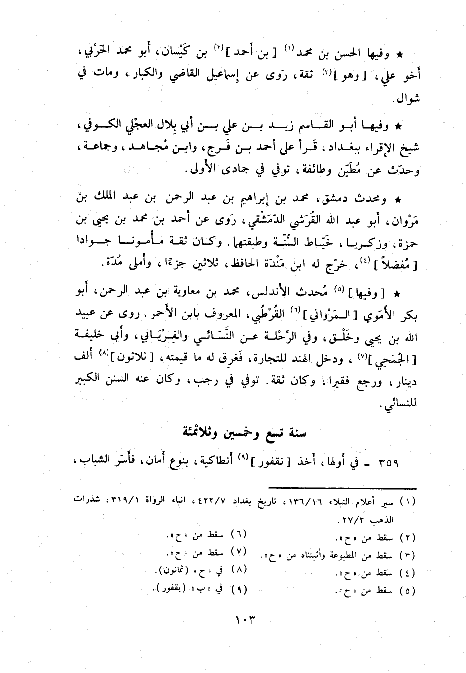 وفيها محدث الأندلس، محمد بن معاوية بن عبد الرحمن، أبو بكر الأموي المرواني القرطبي، المعروف بابن الأحمر. روى عن عبيد الله بن يحيى وخلق، وفي الرِّحلة عن النَّسائي والفريابي، وأبي خليفة الجمحي، ودخل الهند للتجارة، فغرق له ما قيمته، ثلاثون ألف دينار، ورجع فقيراً، وكان ثقة. توفي في رجب، وكان عنه السنن الكبير للنسائي.
