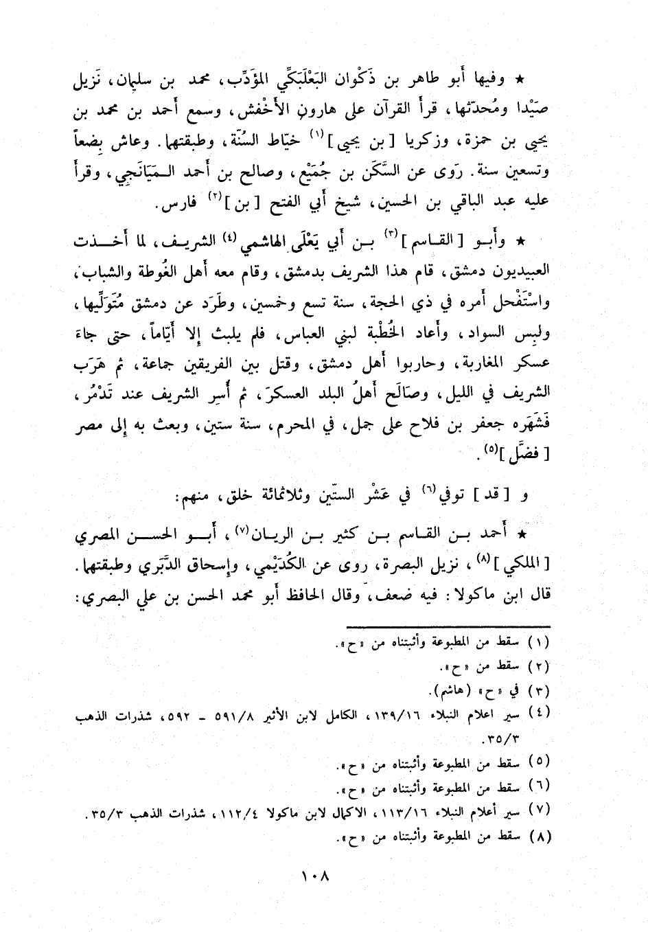 وفيها أبو طاهر بن ذكوان البعلبكِّي المؤدِّب، محمد بن سليمان، نزيل صيدا ومحدّثها، قرأ القرآن على هارون الأخفش، وسمع أحمد بن محمد بن يحيى بن حمزة، وزكريا بن يحيى خيّاط السنّة، وطبقتهما. وعاش بضعاً وتسعين سنة. روى عن السَّكن بن جميع، وصالح بن أحمد الميانجي، وقرأ عليه عبد الباقي بن الحسين، شيخ أبي الفتح بن فارس.