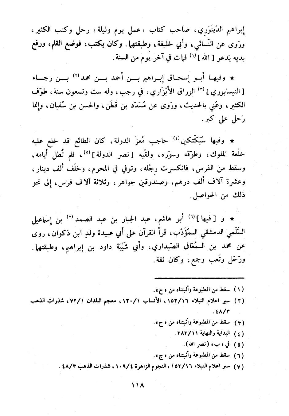 إبراهيم الدِّينوري، صاحب كتاب " عمل يوم وليلة " رحل وكتب الكثير، وروى عن النّسائي، وأبي خليفة، وطبقتهما. وكان يكتب، فوضع القلم، ورفع يديه يدعو الله فمات في آخر يوم من السنة.