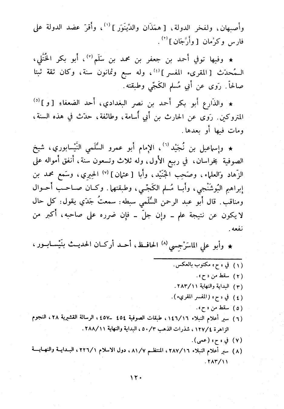وإسماعيل بن نجيد، الإمام أبو عمرو السُّلمي النَّيسابوري، شيخ الصوفية بخراسان، في ربيع الأول، وله ثلاث وتسعون سنة، أنفق أمواله على الزّهاد والعلماء، وصحب الجنيد، وأبا عثمان الحيري، وسمع محمد بن إبراهيم البوشنجي، وأبا مسلم الكجِّي، وطبقتهما. وكان صاحب أحوال ومناقب. قال أبو عبد الرحمن السُّلمي سبطه: سمعت جدي يقول: كل حال لا يكون عن نتيجة علم وإن جلّ فإن ضرره على صاحبه، أكبر من نفعه.