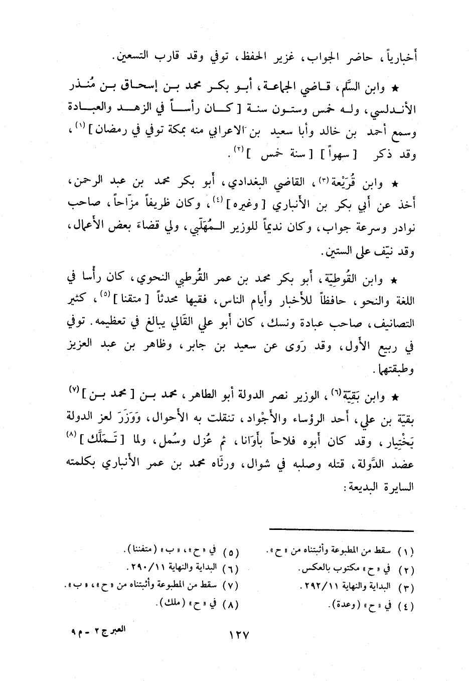 وابن القوطيّة، أبو بكر محمد بن عمر القرطبي النحوي، كان رأساً في اللغة والنحو، حافظاً للأخبار وأيام الناس، فقيهاً محدثاً متقناً، كثير التصانيف، صاحب عبادة ونسك، كان أبو علي القالي يبالغ في تعظيمه. توفي في ربيع الأول، وقد روى عن سعيد بن جابر، وظاهر بن عبد العزيز وطبقتهما.