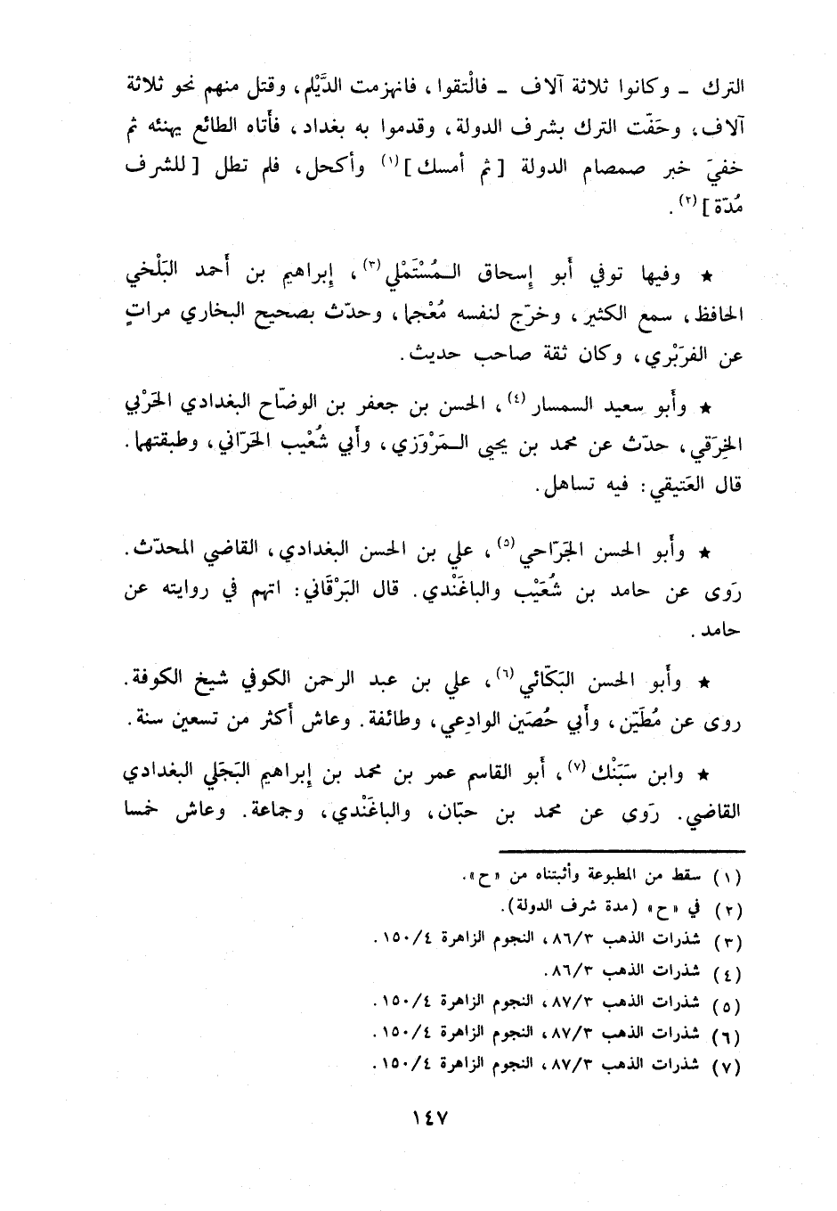 الترك وكانوا ثلاثة آلاف فالتقوا، فاننهزمت الدَّيلم، وقتل منهم نحو ثلاثة آلاف، وحفّت الترك بشرف الدولة، وقدموا به بغداد، فأتاه الطائع يهنئه ثم خفي خبر صمصام الدولة ثم أمسك وأكحل، فلم تطل للشرف مدّة.