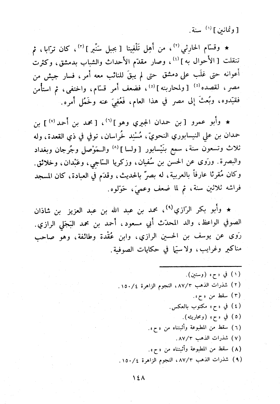 وقسّام الحارثي، من أهل تلفيتا بجبل سنِّير، كان ترّاباً ثم تنقلت الأحوال به، وصار مقدّم الأحداث والشباب بدمشق، وكثرت أعوانه حتى غلب على دمشق حتى لم يبق للنائب معه أمر، فسار جيش من مصر، لقصده ولمحاربته، فضعف أمر قسّام، واختفى، ثم استأمن فقيّدوه، وبعث إلى مصر في هذا العام، فعفي عنه وخمل أمره.