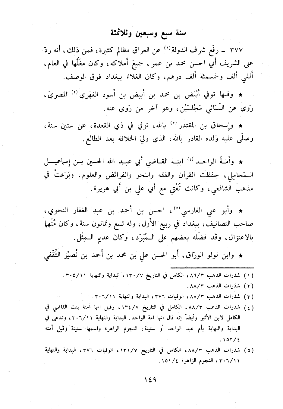 وأبو علي الفارسي، الحسن بن أحمد بن عبد الغفار النحوي، صاحب التصانيف، ببغداد في ربيع الأول، وله تسع وثمانون سنة، وكان متّ؟ هماً بالاعتزال، وقد فضّله بعضهم على المبرّد، وكان عدّيم المثل.