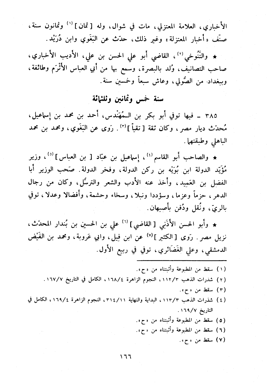 والتَّنوخي، القاضي أبو علي الحسن بن علي، الأديب الأخباري، صاحب التصانيف، ولد بالبصرة، وسمع بها من أبي العباس الأثرم وطائفة، وببغداد من الصُّولي، وعاش سبعاً وخمسين سنة.