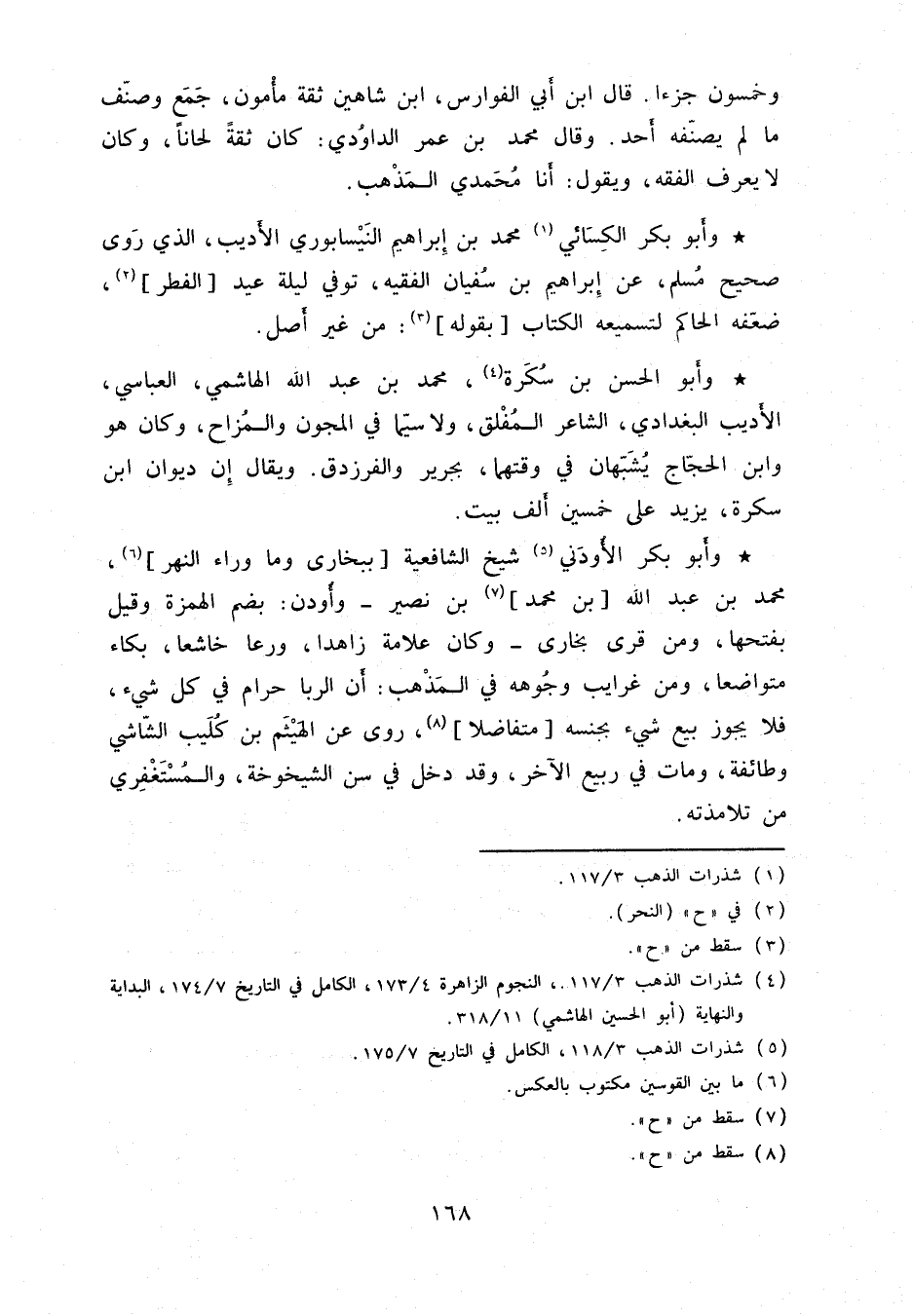 وخمسون جزءاً. قال ابن أبي الفوارس، ابن شاهين ثقة مأمون، جمع وصنّف ما لم يصنّفه أحد. وقال محمد بن عمر الداودي: كان ثقةً لحاناً، وكان لا يعرف الفقه، ويقول: أنا محمدي المذهب.