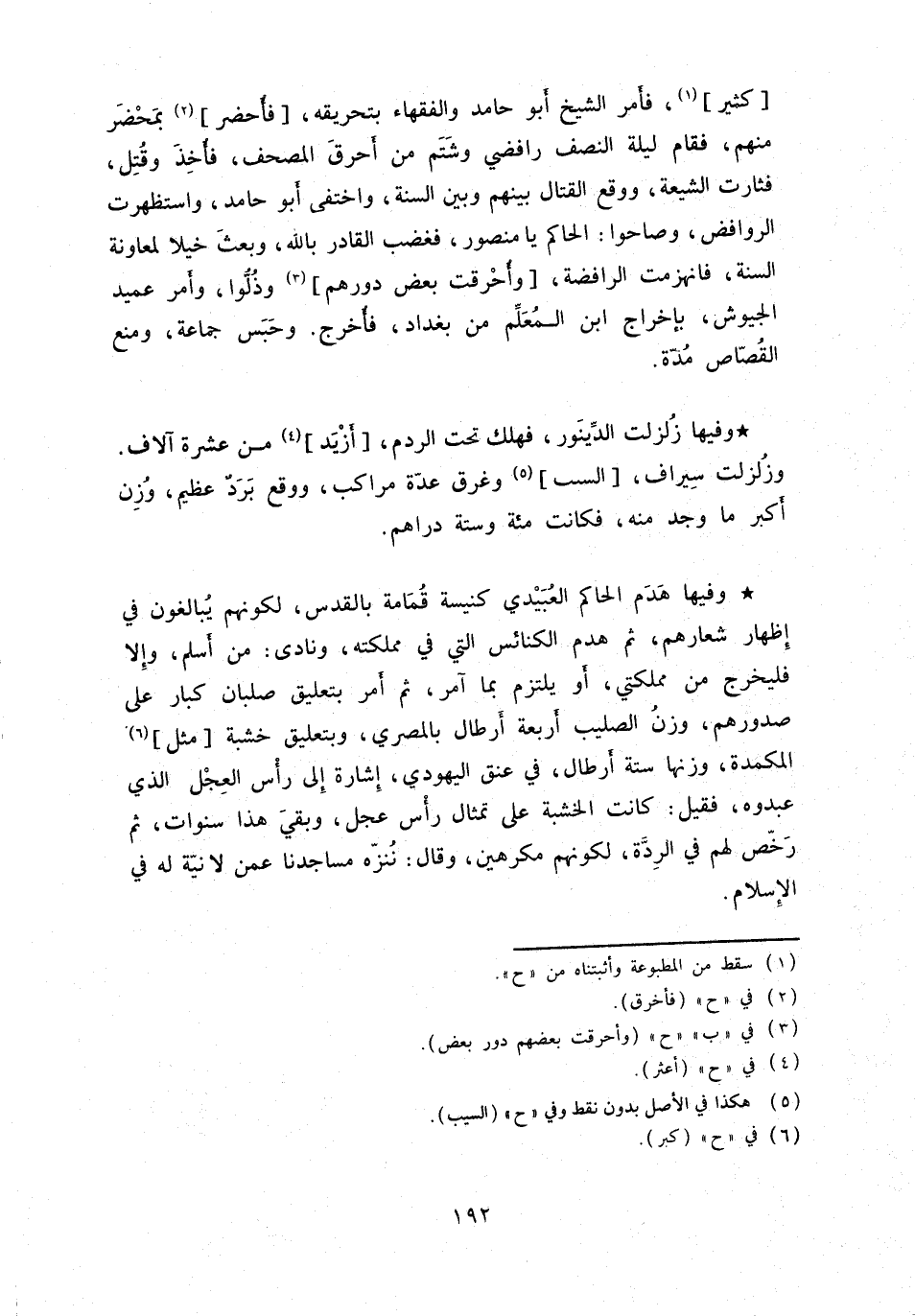 كثير، فأمر الشيخ أبو حامد والفقهاء بتحريقه، فأحضر بمحضر منهم، فقام ليلة النصف رافضي وشتم من أحرق المصحف، فأخذ وقتل، فثارت الشيعة، ووقع القتال بينهم وبين السنة، واختفى أوب حامد، واستظهرت الروافض، وصاحوا: الحاكم يا منصور، فغضب القادر بالله، وبعث خيلاً لمعاونة السنة، فانهزمت الرافضة، وأحرقت بعض دورهم وذلُّوا، وأمر عميد الجيوش، بإخراج ابن المعلِّم من بغداد، فأخرج. وحبس جماعة، ومنع القصّاص مدّة.