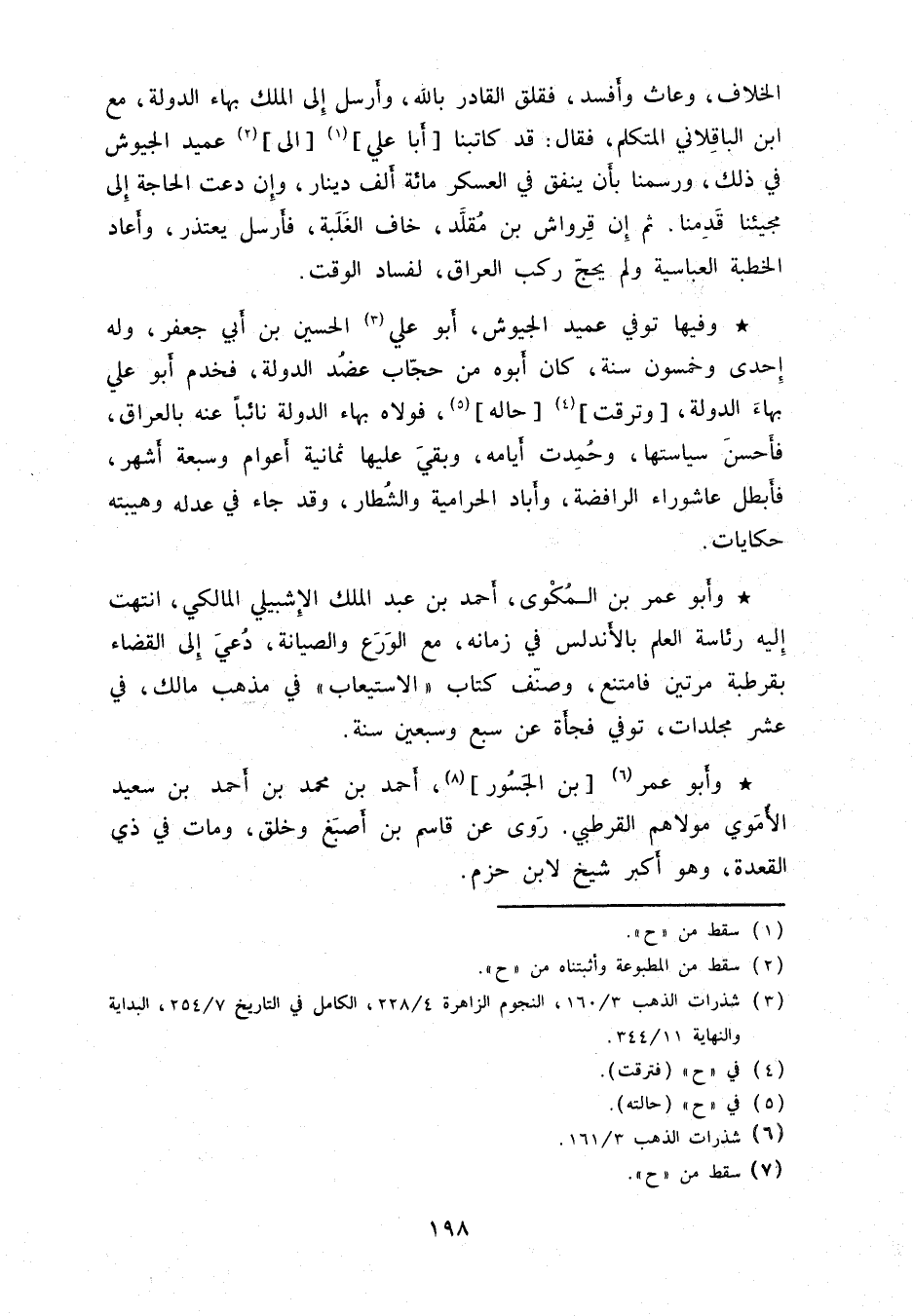 وفيها توفي عميد الجيوش، أبو علي الحسين بن أبي جعفر، وله إحدى وخمسون سنة، كان أبوه من حجّاب عضد الدولة، فخدم أبو علي بهاء الدولة، وترقرقت حاله، فولاه بهاء الدولة نائباً عنه بالعراق، فأحسن سياستها، وحمدت أيامه، وبقي عليها ثمانية أعوام وسبعة أشهر، فأبطل عاشوراء الرافضة، وأباد الحرامية والشطار، وقد جاء في عدله وهيبته حكايات.
