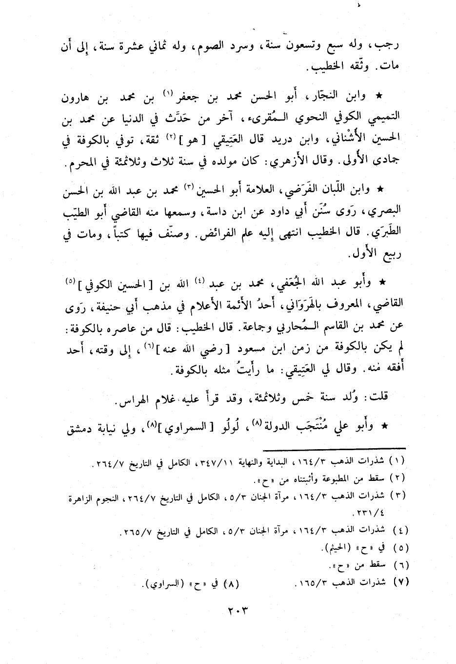 وابن النجّار، أبو الحسن محمد بن جعفر بن محمد بن هارون التميمي الكوفي النحوي المقرئ، آخر من حدَّث في الدنيا عن محمد بن الحسين الأشناني، وابن دريد قال العتيقي هو ثقة، توفي بالكوفة في جمادى الأولى. وقال الأزهري: كان مولده في سنة ثلاث وثلاثمئة في المحرم.