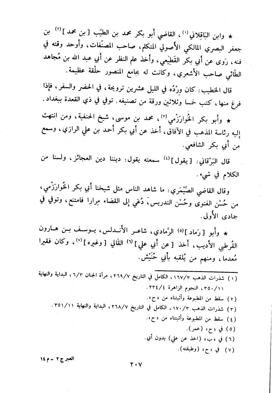 وابن الباقلاني، القاضي أبو بكر محمد بن الطيّب بن محمد بن جعفر البصري المالكي الأصولي المتكلم، صاحب المصنّفات، وأوحد وقته في فنه، روى عن أبي بكر القطيعي، وأخذ علم النظر عن أبي عبد الله بن مجاهد الطائي صاحب الأشعري، وكانت له بجامع المنصور حلقة عظيمة.