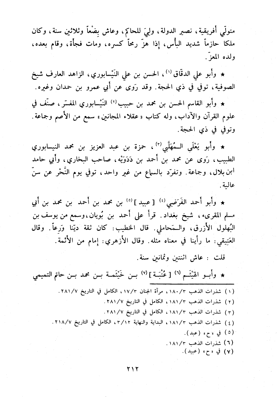 وأبو علي الدقّاق، الحسن بن علي النيسابوري، الزاهد العارف شيخ الصوفية، توفي في ذي الحجة. وقد روى عن أبي عمرو بن حمدان وغيره.