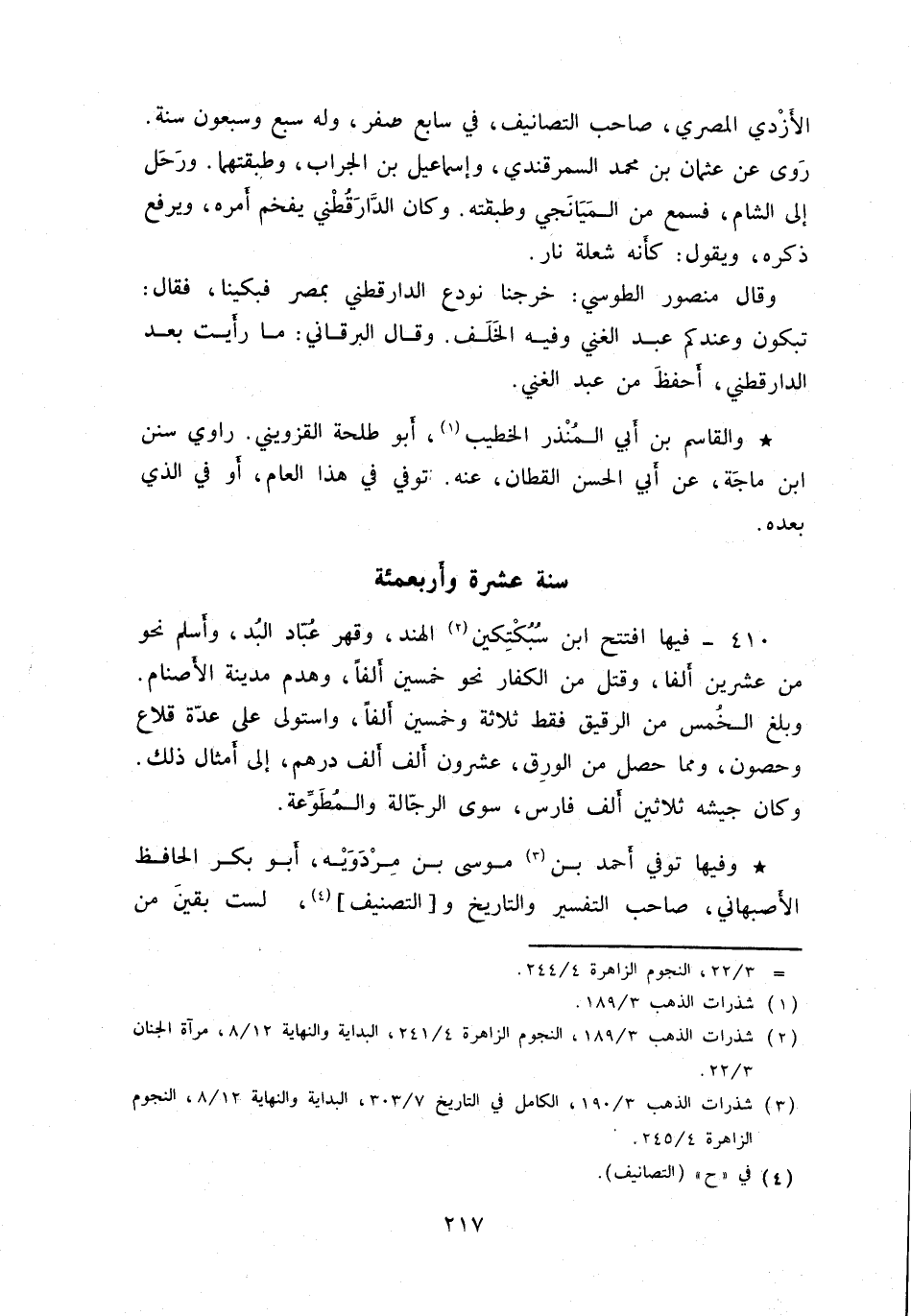 فيها افتتح ابن سبكتكين الهند، وقهر عبّاد البد، وأسلم نحو من عشرين ألفاً، وقتل من الكفار نحو خمسين ألفاً، وهدم مدينة الأصنام.
