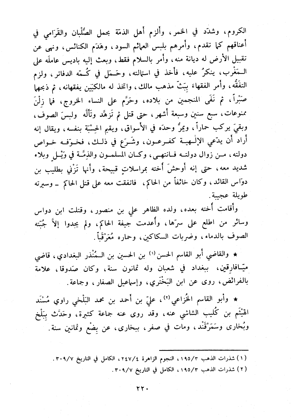 الكروم، وشدّد في الخمر، وألزم أهل الذمّة بحمل الصُّلبان والقرامي في أعناقهم كما تقدم، وأمرهم بلبس العمائم السود، وهدم الكنائس، ونهى عن تقبيل الأرض له ديانة منه، وأمر بالسلام فقط، وبعث إليه باديس عامله على المغرب، ينكر عليه، فأخذ في استمالته، وحمل في كمّه الدفاتر، ولزم التفقُّه، وأمر الفقهاء ببثّ مذهب مالك، واتخذ له مالكيين يفقهانه، ثم ذبهما صبراً، ثم نفى المنجمين من بلاده، وحرَّم على النساء الخروج، فما زلن ممنوعات، سبع سنين وسبعة أشهر، حتى قتل ثم تزهَد وتألَّه ولبس الصوف، وبقي يركب حماراً، ويمرُّ وحده في الأسواق، ويقيم الحسبة بنفسه، ويقال إنه أراد أن يدّعي الإلهية كفرعون، وشرع في ذلك، فخوّفه خواص دولته، من زوال دولته فانتهى، وكان المسلمون والذمَّة في ويل وبلاء شديد معه، حتى إنه أوحش أخنه بمراسلات قبيحة، وأنها تزني بطليب بن دوّاس القائد، وكان خائفاً من الحاكم، فاتفقت معه على قتل الحاكم وسيرته طويلة عجيبة.