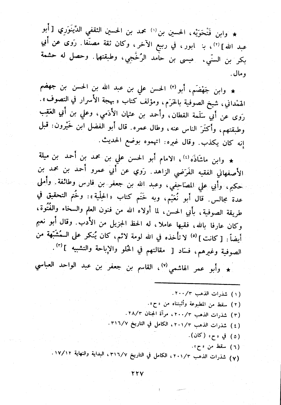 وابن ماشاذه، الإمام أبو الحسن علي بن محمد بن أحمد بن ميلة الأصفهاني الفقيه الفرضي الزاهد، روي عن أبي عمرو أحمد بن محمد بن حكيم، وأبي علي المصاحفي، وعبد الله بن جعفر بن فارس وطائفة، وأملى عدة مجالس، قال أبو نعيم، وبه ختم كتاب الحلية: وختم التحقيق في طريقة الصوفية، بأبي الحسن، لما أولاه الله من فنون العلم والسخاء والفتوة، وكان عارفاً بالله، فقيهاً عاملاً، له الحظ الجزيل من الأدب. وقال أبو نعيم أيضاً: كانت لا تأخذه في الله لومة لائم، كان ينكر على المشبهة من الصوفية وغيرهم، فساد مقالتهم في الحلو والإباحة والتشبيه.
