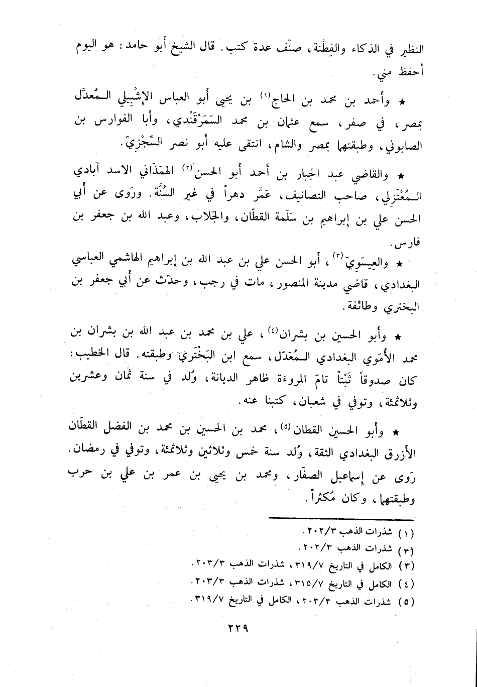 النظير في الذكاء والفطنة، صنّف عدة كتب. قال الشيخ أبو حامد: هو اليوم أحفظ مني: وأحمد بن محمد بن الحاج بن يحيى أبو العباس الإشبيلي المعدَّل بمصر، في صفر، سمع عثمان بن محمد السمرقندي، وأبا الفوارس بن الصابوني، وطبقتهما بمصر والشام، انتقى عليه أبو نصر السجزيّ.