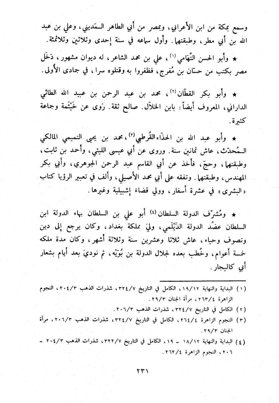 وأبو عبد الله بن الحذّاء القرطبي، محمد بن يحيى التميمي المالكي المحدّث، عاش ثمانين سنة. وروى عن أبي عيسى الليثي، وأحمد بن ثابت، وطبقتهما، وحجّ، فأخذ عن أبي القاسم عبد الرحمن الجوهري، وأبي بكر المهندس، وطبقتهما. وتفقه على أبي محمد الأصيلي، وألف في تعبير الرؤيا كتاب " البشرى " في عشرة أسفار، وولي قضاء إشبيلية وغيرها.