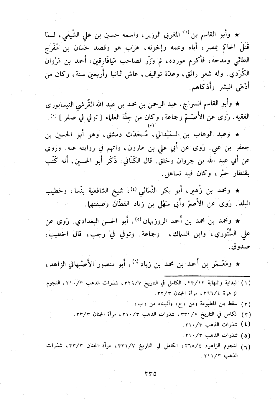 وأبو القاسم السراج، عبد الرحمن بن محمد بن عبد الله القرشي النيسابوري الفقيه. روى عن الأصم وجماعة، وكان من جلَّة العلماء توفي في صفر.