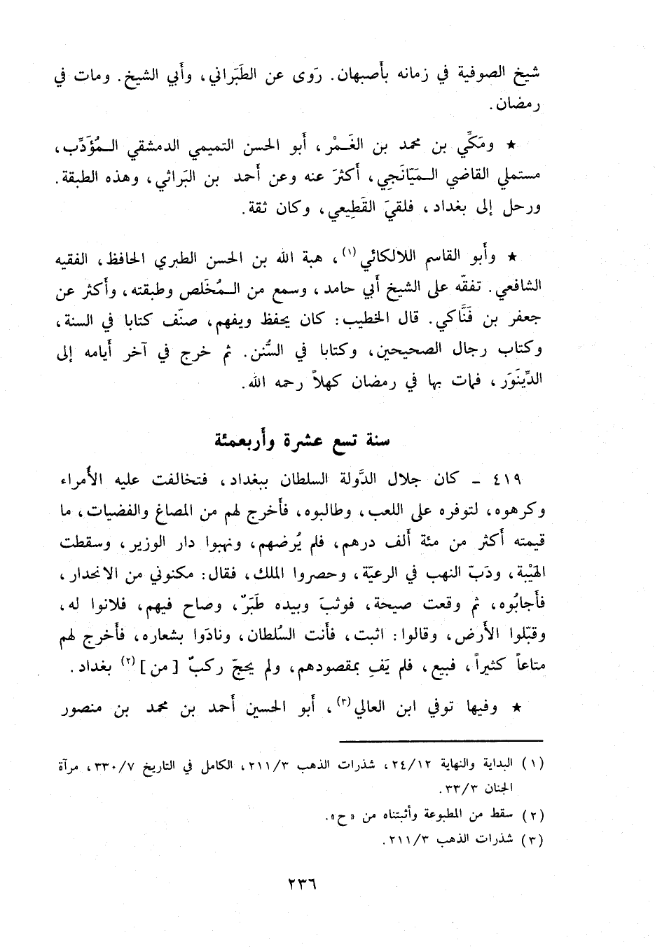 وأبو القاسم اللالكائي، هبة الله بن الحسن الطبري الحافظ، الفقيه الشافعي. تفقّه على الشيخ أبي حامد، وسمع من المخلص وطبقته، وأكثر من جعفر بن فنَّاكي. قال الخطيب: كان يحفظ ويغهم، صنّف كتاباً في السنة، وكتاب رجال الصحيحين، وكتاباً في السُّنن. ثم خرج في آخر أيامه إلى الدِّينور، فمات بها في رمضان كهلاً رحمه الله.